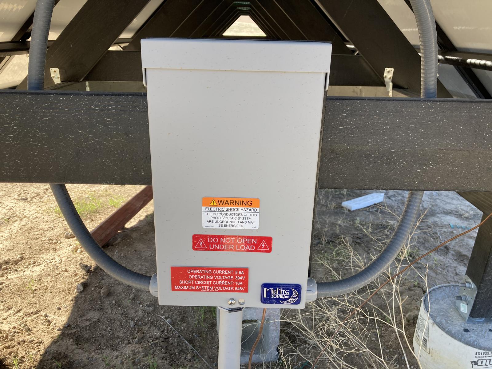 Just like on the large frames, the wiring has to be protected from fingers. The whole thing is wired up in much the same way, with a smaller passthrough box up high to transition the PV wire into conduit.