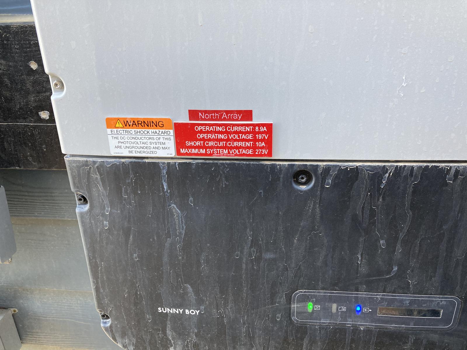The inverters are labeled with the proper bits and pieces, including operating voltages and currents (per string). The conduit running up into the inverters is labeled as well with the proper markings to indicate that it’s DC PV and you shouldn’t cut it.