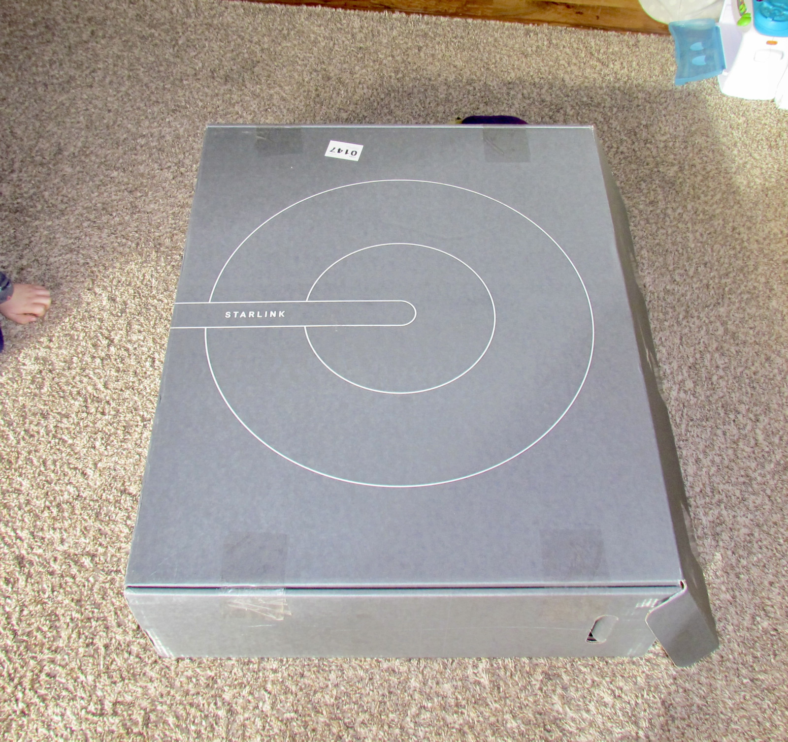 Starlink comes in a rather large, somewhat subtle box. It’s clearly a Starlink terminal based on the box, and it’s on the big side, but nothing larger than what a normal 27” monitor might come in. Of note here, the box doesn’t use glossy clay inks on the cardboard to make it shiny (these can cause problems for recycling cardboard). Just a good, solid cardboard box.