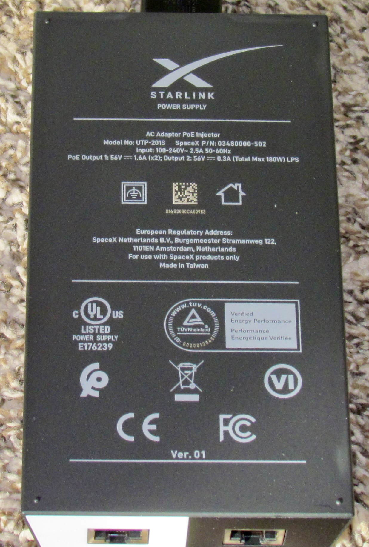 Pulling stuff out, the back of the POE injector already has some interesting data - output is a 56V POE, with a rather surprising amount of power behind it (up to 180W). Early reviews believed Dishy had a heater to melt snow, and I can confirm that it runs hot. Unfortunately, there’s no heater involved. It just runs hot. I’ll talk about this more in the power consumption section, but the power consumption is quite obscene.