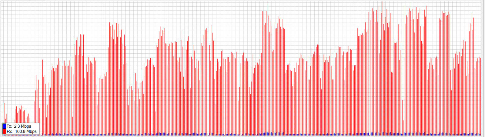 The real weirdness (in terms of internet connections) is that the speed varies wildly, and all over the place. I loaded up a box with a ton of Ubuntu ISO torrents (the best thing I could think of for “There is literally unlimited bandwidth to seed this”), and charted bandwidth. The results kind of speak for themselves - it’s a constant up/down, and while peak is about 160Mbit (properly good for out here), the actual download speed is just a random walk. Yes, you see some nice peaks, but the actual delivered bandwidth is far from consistent.