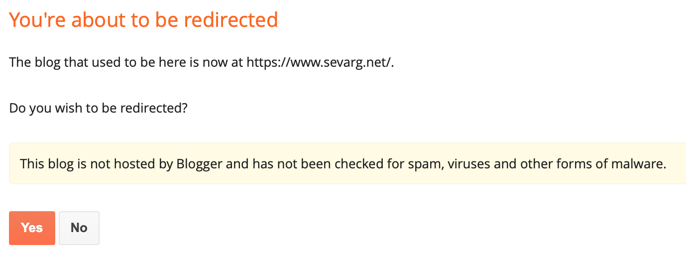 It’s not a 301 redirect, and as near as I can tell most of my content has gone missing from search results (quite annoyingly, but… at this point I really don’t care - I’m no longer trying to monetize my blog). But I’d rather not needlessly break links, even if I am moving to totally different hosting. A link to my old Blogspot domain will be redirected to my new domain after a warning, and then you get redirected to the new location. Clean enough.