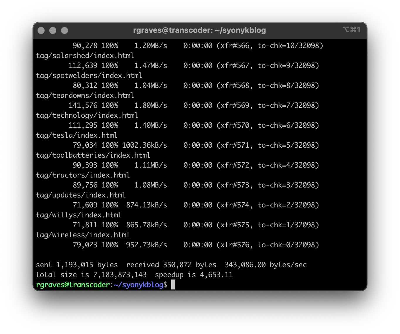 I don’t get the benefit of having a full remote server to render content on, so I simply render it locally on a VM then sync it up. The gsutil utility for interacting with Cloud Storage has an rsync function that will transfer deltas, and I’ve got a little script set up that pushes image content first (as that’s likely to be larger and take longer for most of my posts), then syncs the text bits, compressing them for transmission (HTML gzips very well). Build, publish, done. I’m learning that Cloudflare takes a while to catch some of the changes to the index page, so once it’s synced, if I don’t see the changes, I just wait.