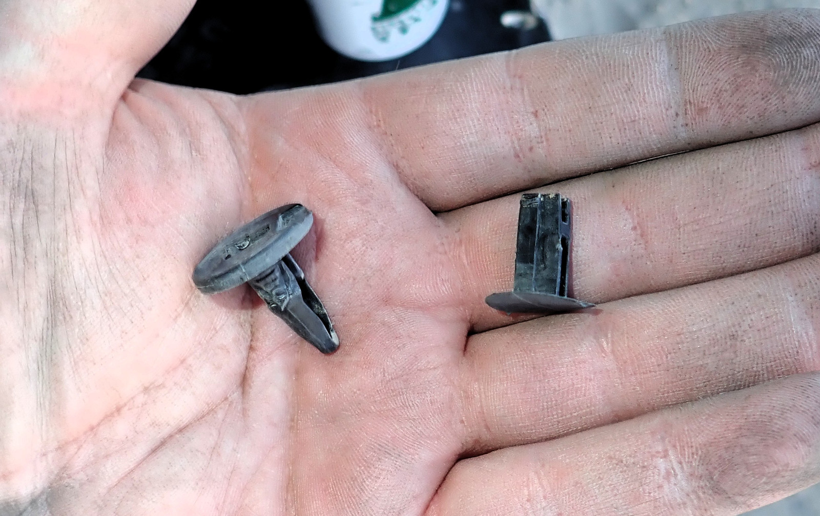 If you’re not familiar with these things, they’re a two part assembly. Pull the center button out (or pry it out with a flathead screwdriver, more likely), and the rest should then be free to come out. When you push the button in, it spreads the grips such that the assembly remains firmly in place. After a number of years, they tend to be quite irritating to get apart, although this one came out without fragmenting into a ton of pieces, which is always nice!