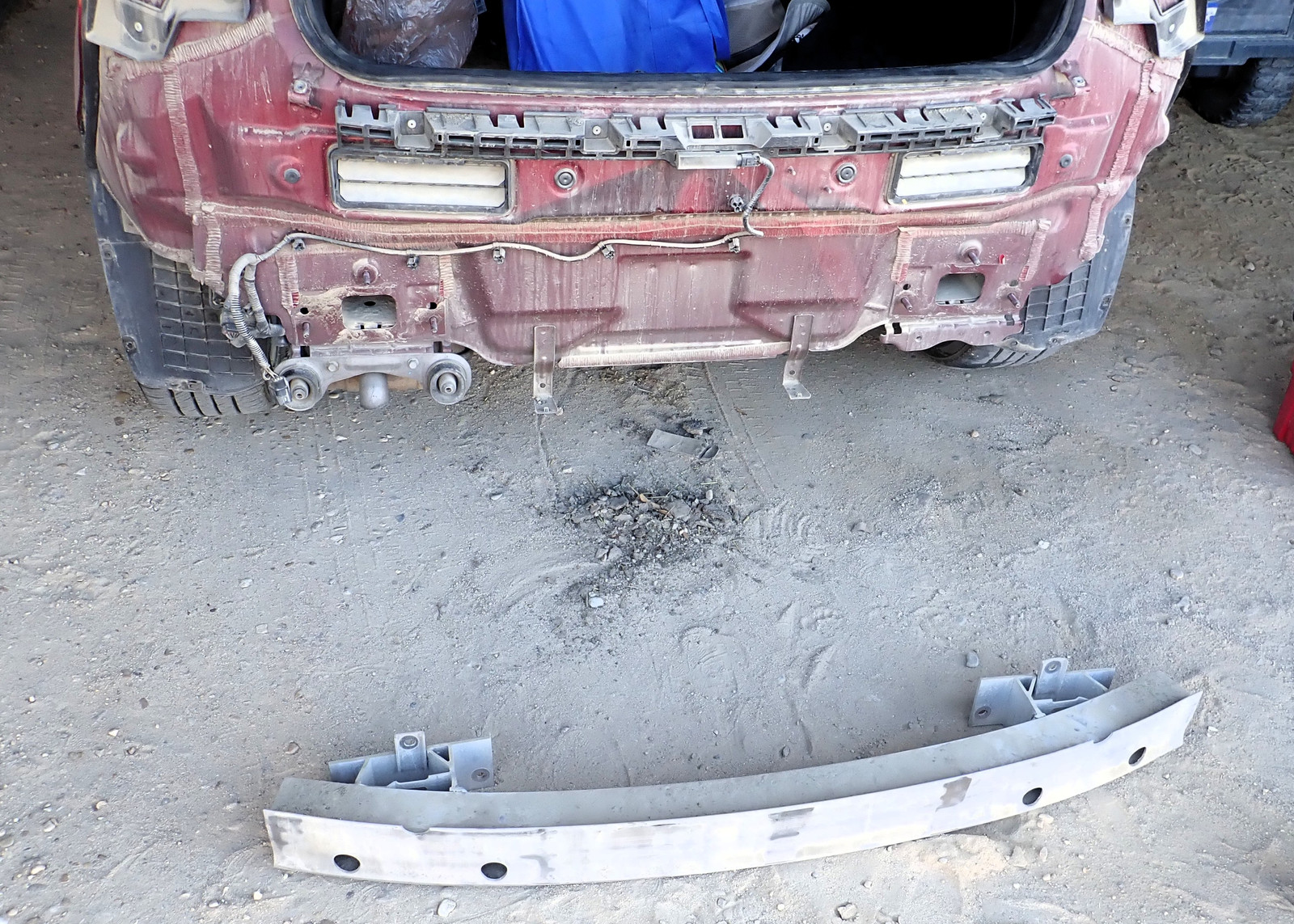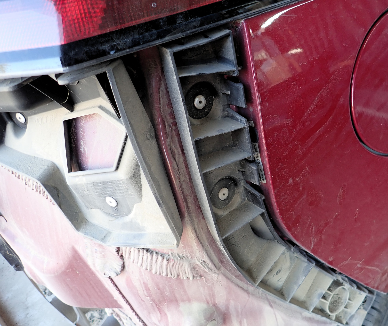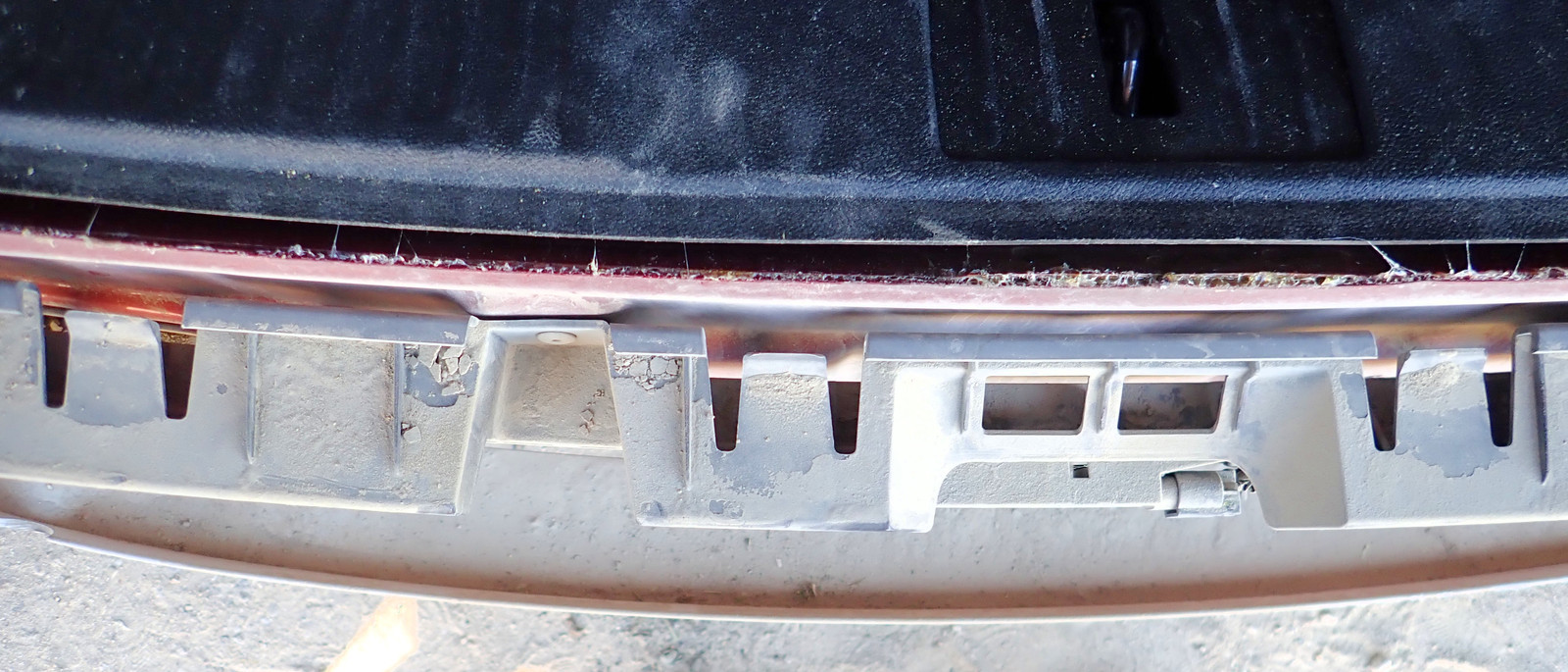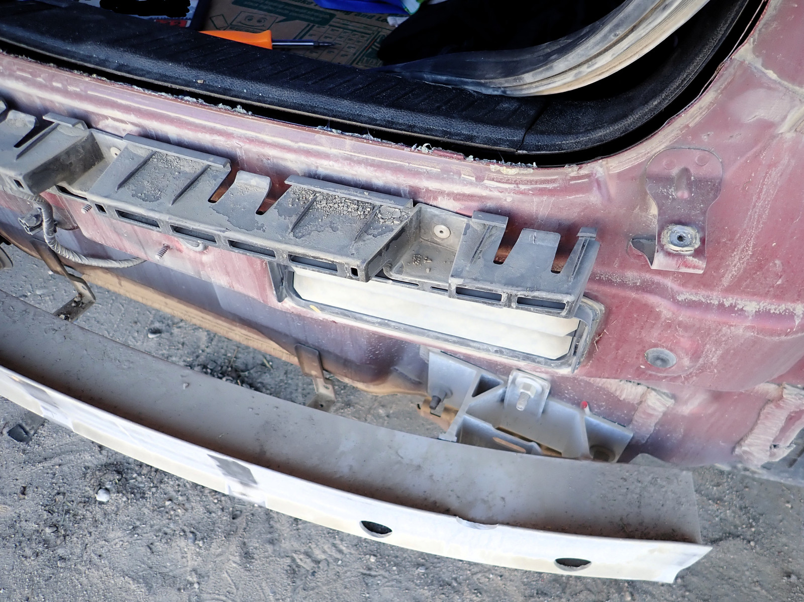 The car looks a lot less substantial in the rear without it. You can see the cabin vent flaps (the louver looking things) - if the HVAC is sucking in outside air, the rubber flaps allow air to exit out the back into the bumper surround. You can also see the large aluminum bumper assembly, which is what we will be putting the hitch under.
