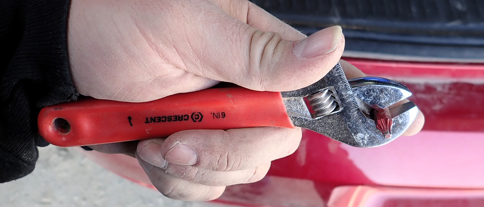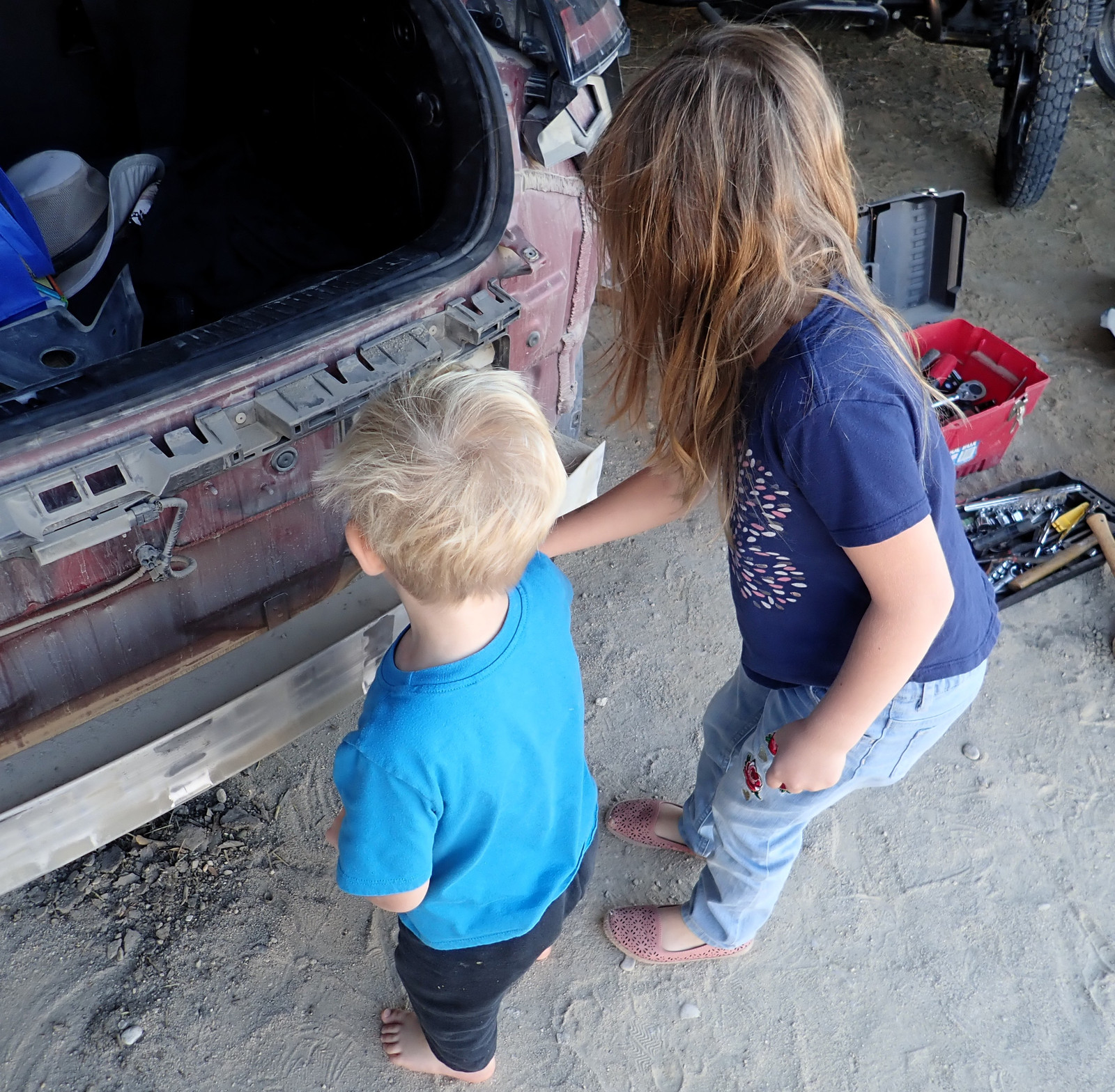 With the whole surround removed, the next step is to remove the actual aluminum bumper bar - which is the sort of wrench turning that can be done very effectively by loosening the bolts slightly and handing off the wrench to a couple kids who were looking for ways to help out. Removing bolts is a good one!