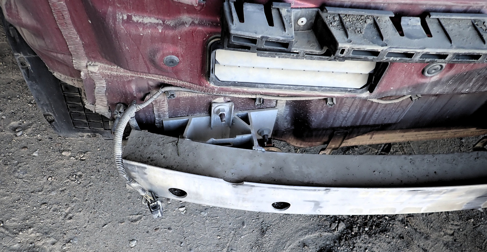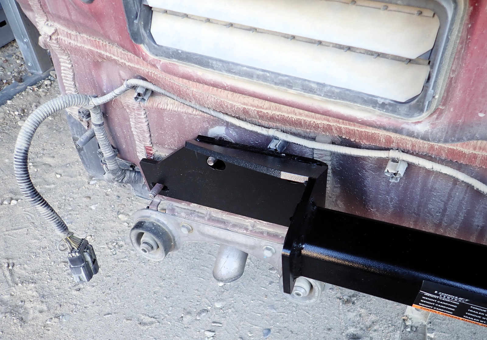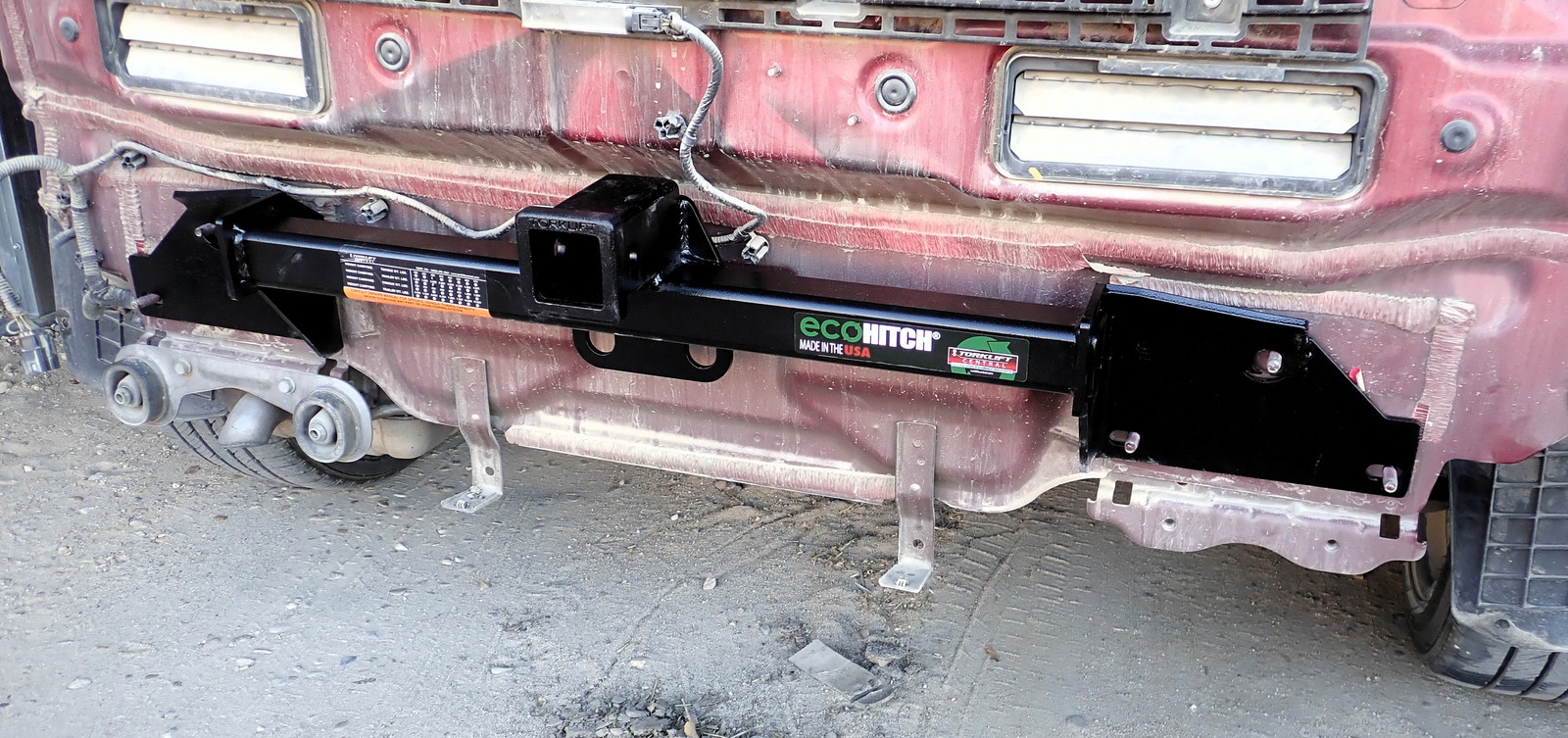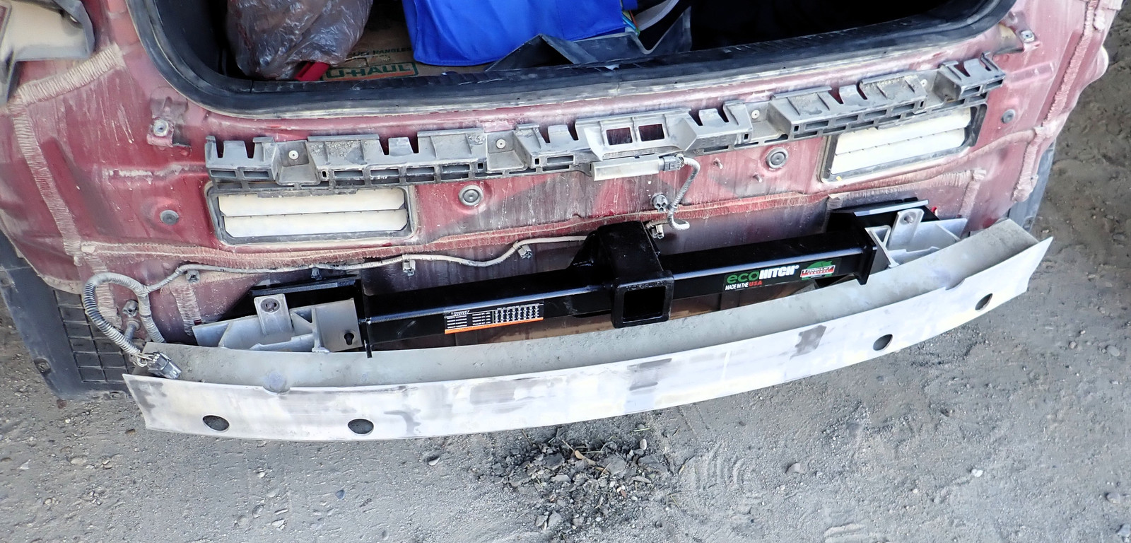 The bumper sits back over the new receiver, and it’s time to bolt things back together! The slight offset from the receiver doesn’t seem to bother anything during reassembly.