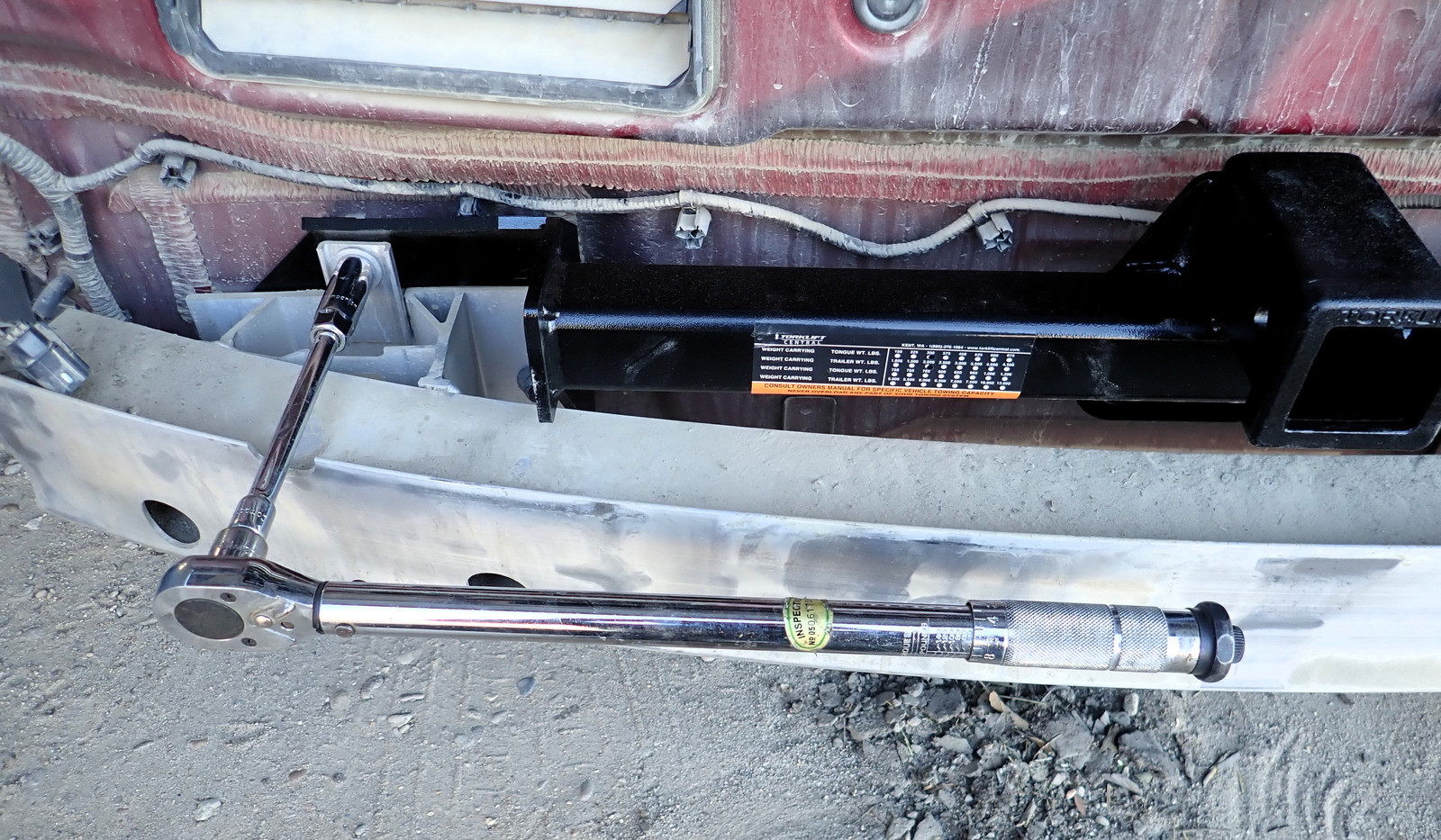 Bolt the stack back together. There is a torque spec in the manual for the install, and I’d suggest following it. It’s a hair tighter than I would have put in for the bolt without a torque wrench, but presumably it’s there for a reason. I didn’t snap anything off, and nothing felt like it was yielding, so, probably fine! There is a bit of shifting of something as you torque the nuts down, and I think the bumper and receiver are fitting to each other a bit here.