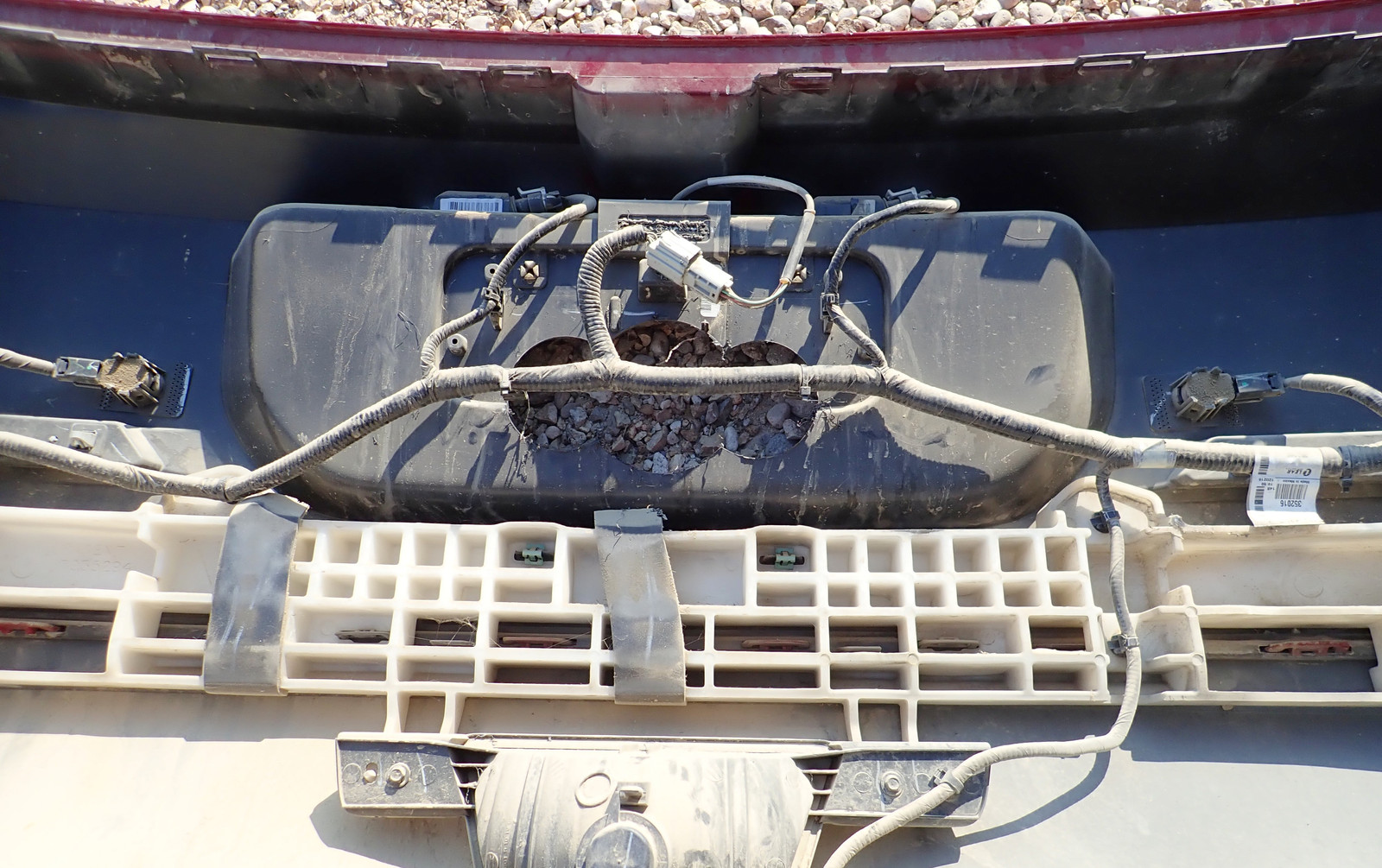 On the left end, there’s a wire harness connector that has to be pulled free - and there’s not really enough slack to set the surround on the ground to do so. It’s a standard auto connector - push the tab while pushing the halves of the connection towards each other, and it should click free and let you pull them apart. This is the connection for the ultrasonic sensors, the backup camera, and the big triangular rear light that’s exactly where one might normally put a trailer hitch.