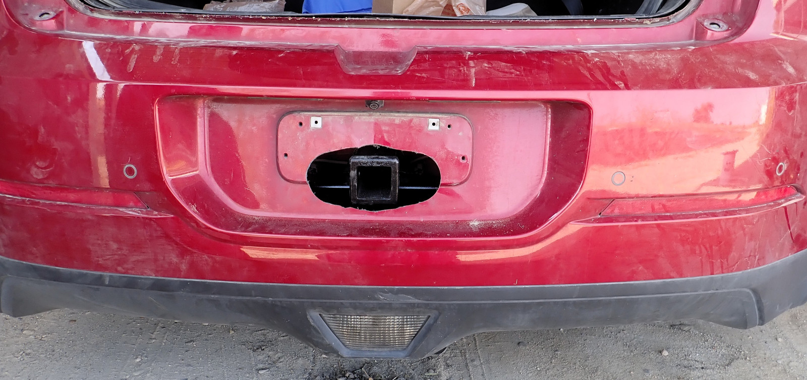 The bumper surround goes back on they way it came off, snapping onto the clips, and… heyo! That’s a 2” receiver poking out the middle of the hole I drilled! Perfect!