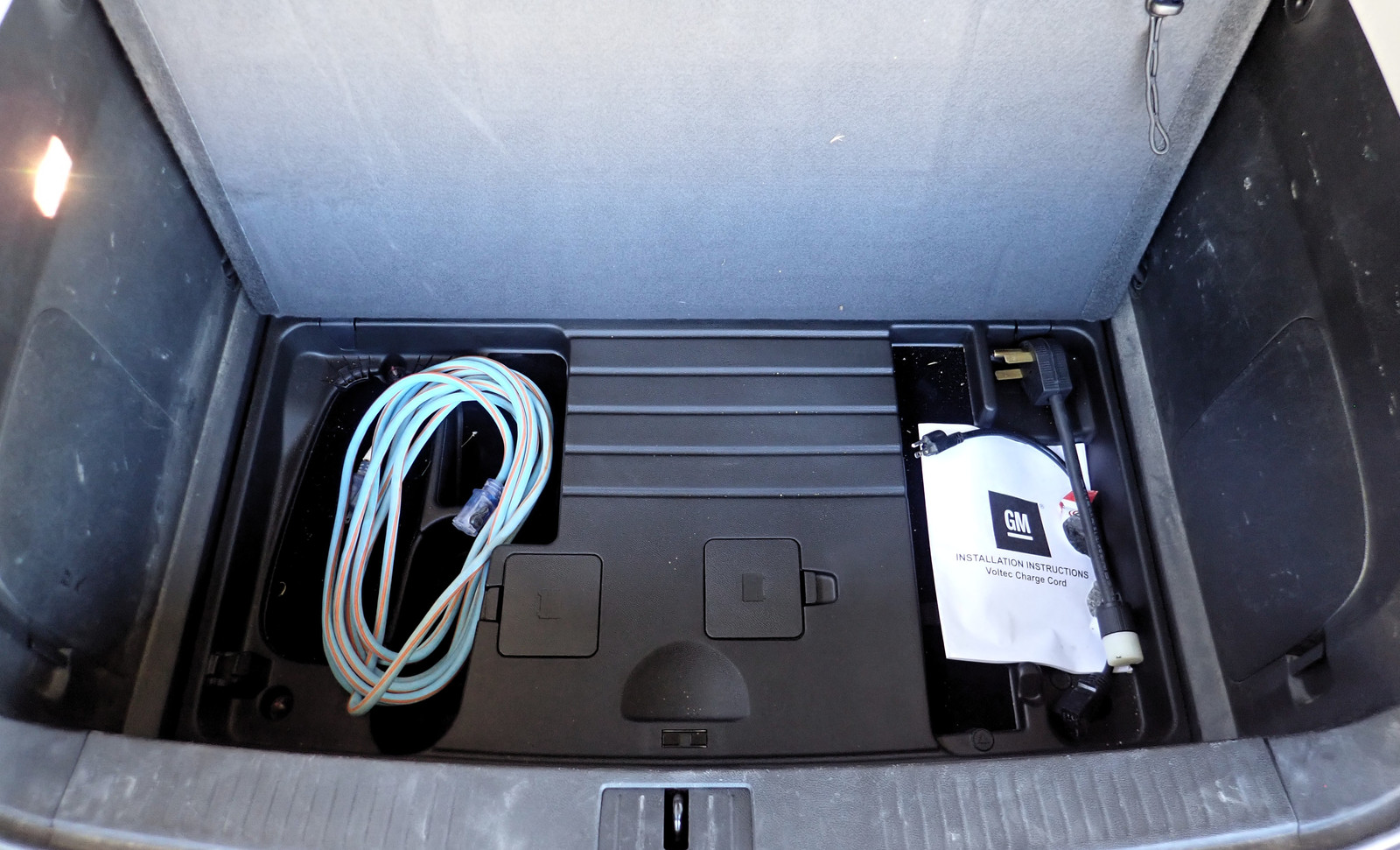 Flip that up, and you’ve got the rear secret storage cubbies. This isn’t anywhere near as nice as some old Subarus (the spare tire was up front under the hood) that could fit a whole CV shaft in the rear tool compartment, but it’s not too bad either - I can put some chargers down here and have room for extension cords and adapters. Unfortunately, there’s no spare tire to be found. Just an air compressor and some sealant goop. I also have some storage cubbies on the side, one of which is going to be very useful!