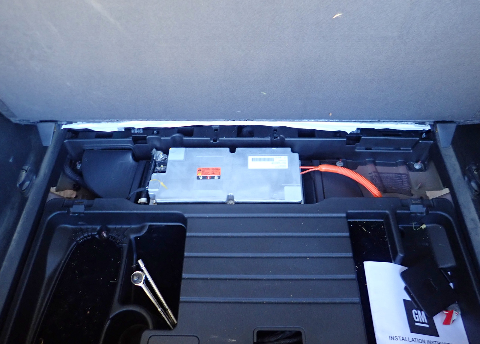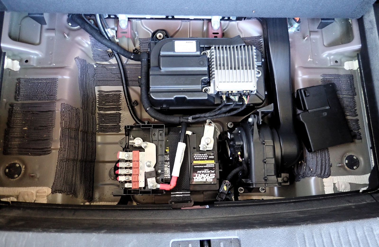 With the tray out, you can see the full 12V battery back here (at the bottom), a blower for… something (cooling the charger, I think), and some more electronics that I’m not actually clear on what they do but look an awful lot like the DC-DC converters that run the 12V bus off the main traction battery. The blower vents out very near the rear vent flaps, and I expect is one of the many random things that turns on and off while the car is charging, especially in the summer. I love the Volt - don’t get me wrong - but it is, by far, the loudest car I’ve ever had when it’s turned “off.” All sorts of clacking, clicking, blowers, pumps… this is an example of an “always live” system, and all the power button does is control a couple of the displays (though they may light up and show something useful before you get near them with the power button). If you’re going to leave a Volt for a long while, definitely put a battery tender on it.