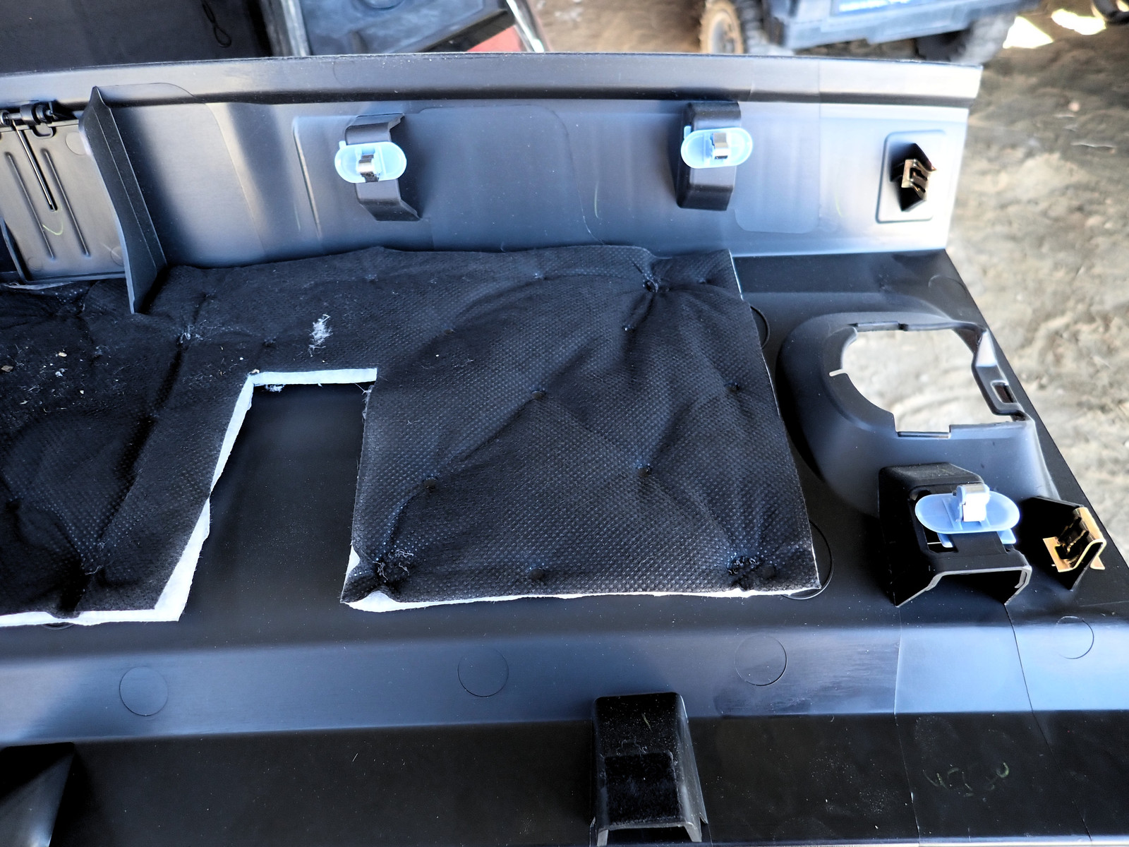 With those out of the way, you can pull the rear trim piece off. It’s stiff. I promise, it just pulls off. Start at the bottom corners and pull them free (you can see the snaps here), and once the bottom is pulled out, go across the top - it really does just pull off, even if it’s tight. Some nice sound deadening back there.