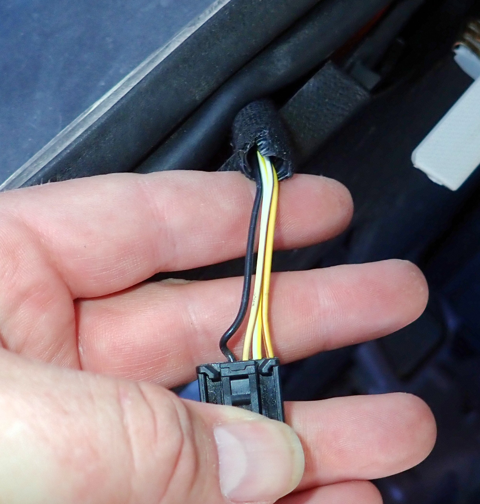 Reach in on the left, find the connector for the left tail light, and remove it. There are three wires here, and I really only know what two are. The larger diameter center wire (ignoring the black ground wire) is the tail light signal - splice into this for the tail lights. The yellow/brown outside wire is the turn signal. Splice this for the turn signal. I’m not actually sure what the other wire is - perhaps it’s intended for reverse lights or something that never got implemented.