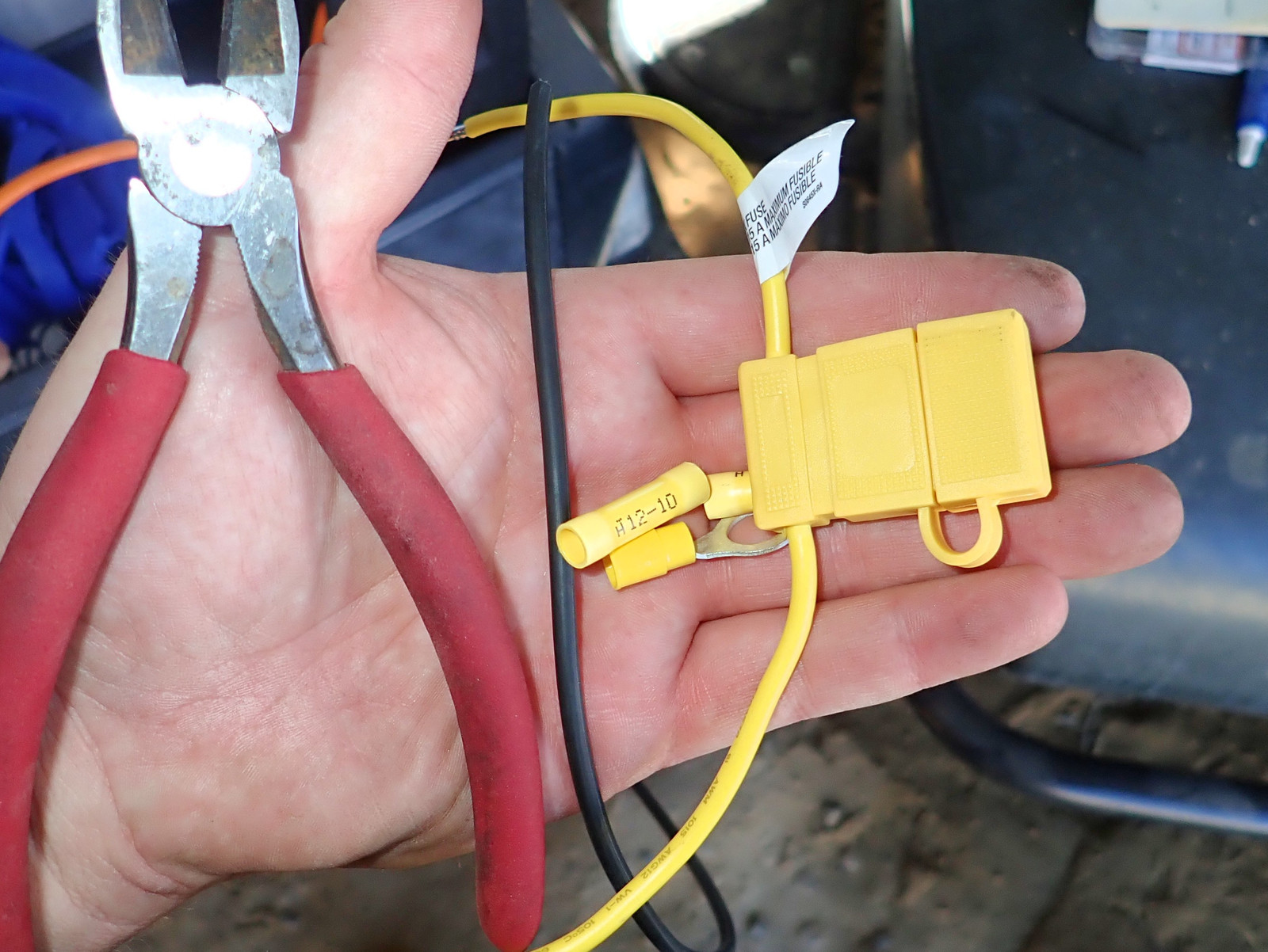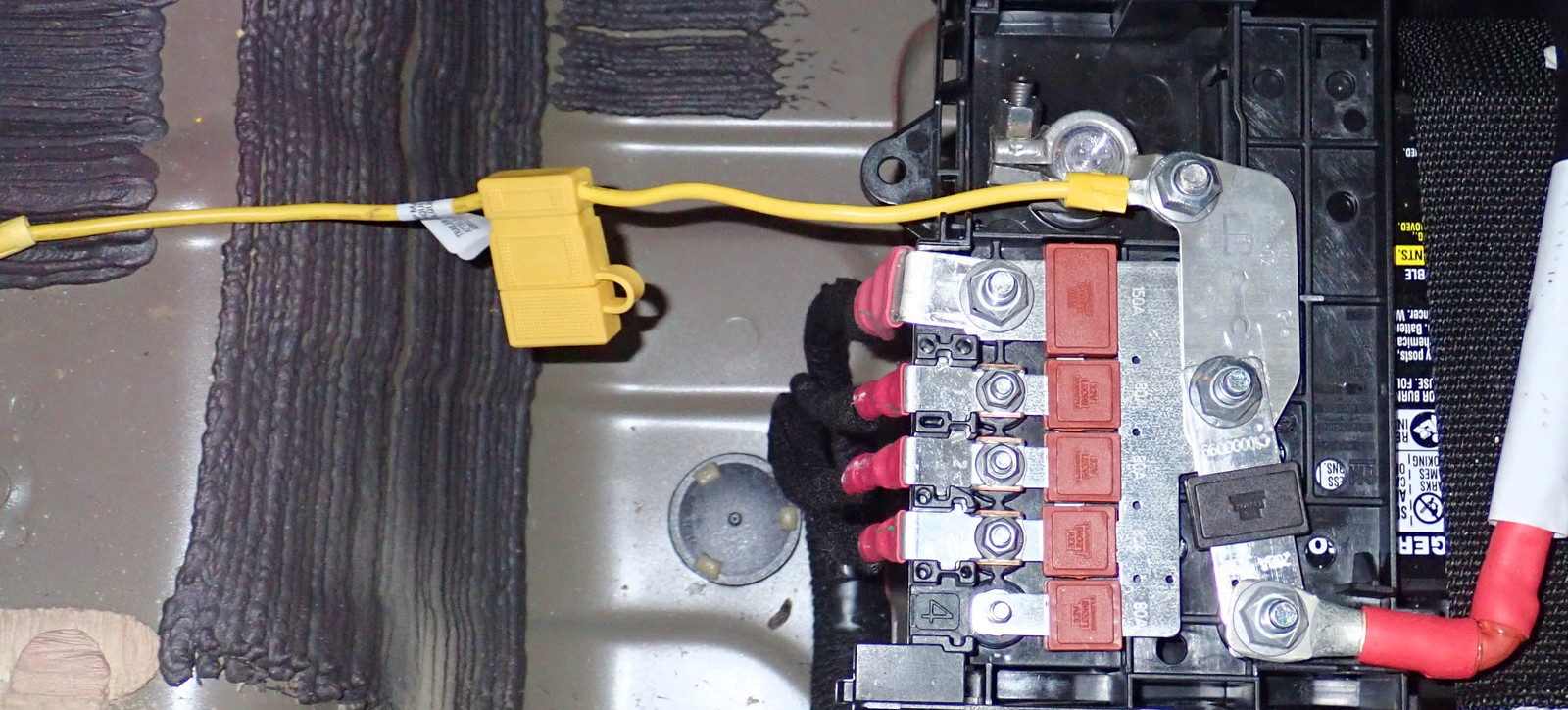 I somehow failed to get a good picture of the ground - but there’s a grounding lug right at the front of the left compartment that’s just perfect to attach the ground for the converter. The battery is a bit trickier - I would have loved to use the spare lower fused connection, but I couldn’t find anything that fit the stud laying around, and didn’t want to force a not-quite-right nut on for something like this. So, I used a different connection and it’s working fine.