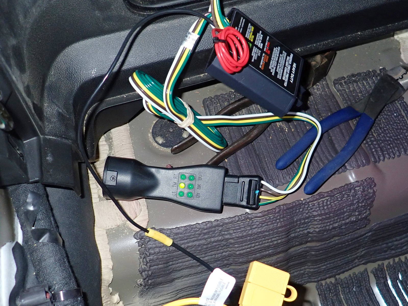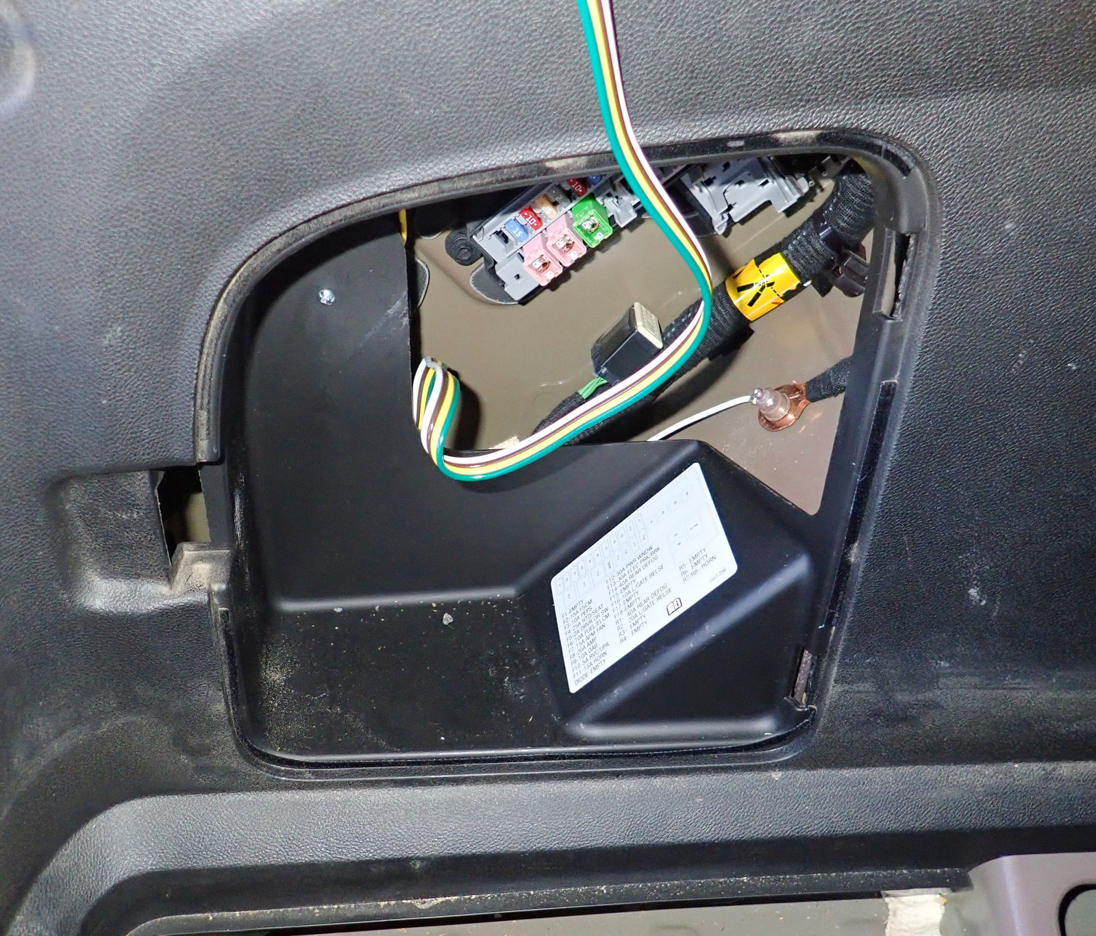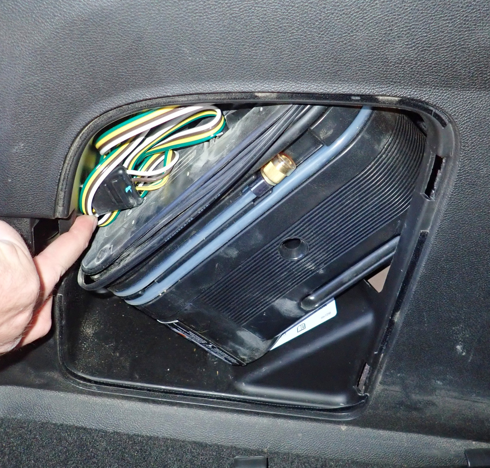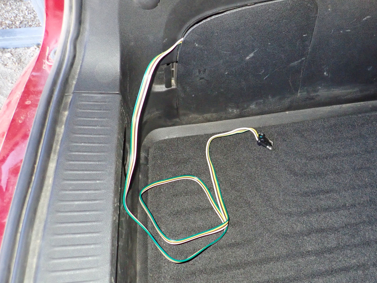 The way it’s set up, I can have the ribbon cable tucked back in the side storage compartment when not in use, and I can stretch it out and drop it down to the trailer when needed! Some suggestions involve cutting another hole in the car to drop the wiring harness outside, but I’m happy enough to just run the flat wire through the trunk seal when I need it. It works fine, doesn’t involve drilling more holes, and I just don’t intend to be towing that often with the car.
