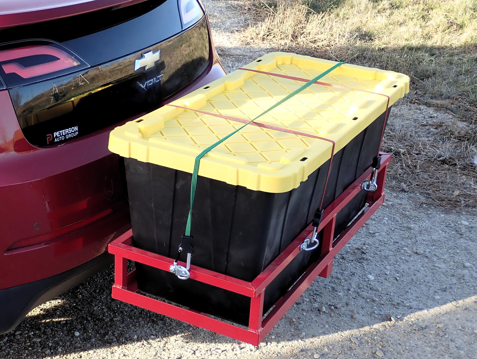 A number of the longer trips we’ve made over the years have involved either hauling a lot of stuff or dealing with the very real risks of bad weather (snowy mountain passes for Thanksgiving or Christmas with the possibility of winter camping for a day or two if the roads are closed), so we take the truck for those. It hauls more and has far better bad weather abilities than the Volt (which has a ground clearance of “Uh… what ground clearance?”). For this trip, all we needed to move were people. However, with a small car (the 1st gen Volt is not a large car) and a long trip, cargo space is limited. You can stuff a lot in the rear, but I also happen to like rear visibility if I can manage it. So, what’s one to do?