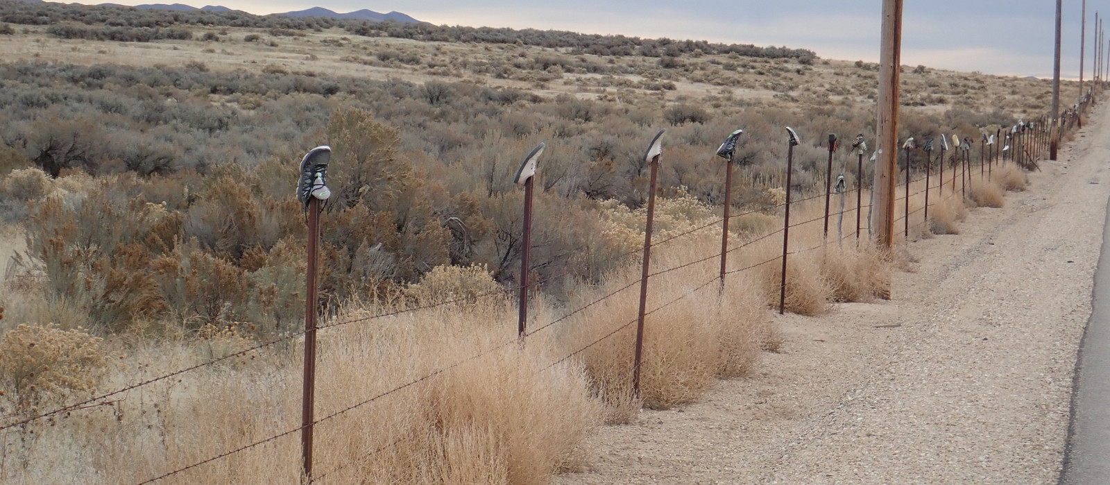 Heading out, we took a stop early on to add some old boots to the shoe fence. I couldn’t tell you the history of why many miles of fence have shoes on them, but they do - so we added a pair of absolutely worn out winter boots from one of the kids. Most of the stuff our kids outgrow gets passed on to other families with kids (our church has a ton of kids, and clothing just circulates around in large bags and boxes), but this set of boots was coming apart so badly it wasn’t repairable. On the fence they go!