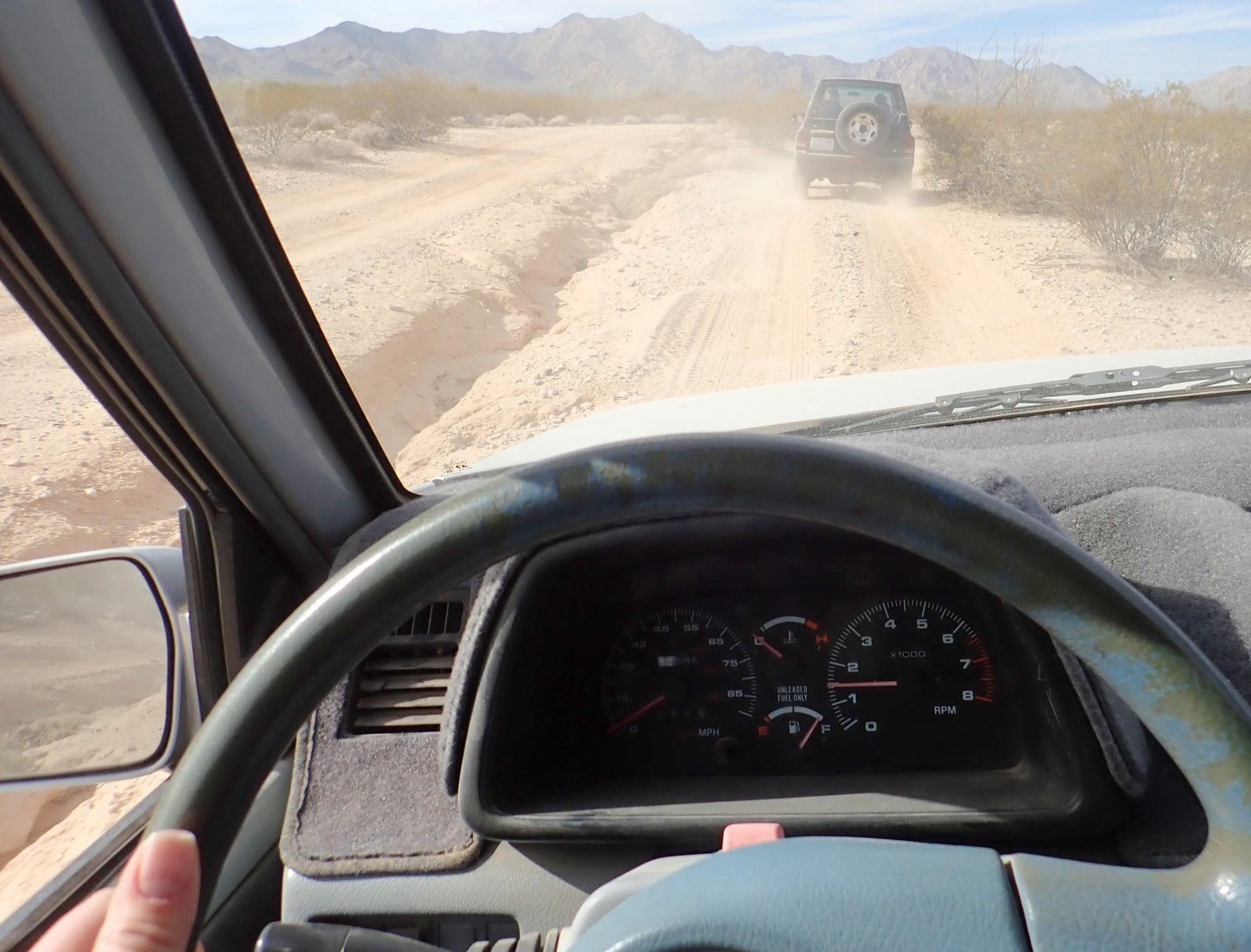 Maybe keep the wheel out of the ditch… and, yes, I know the coolant temperature gauge doesn’t work. Like most AZ vehicles, this one has the “dash carpet” that helps protect the dashboard from the blisteringly hot sun. If you don’t have that, the dash will start cracking inside a few years from the extreme heat. In Phoenix, in the summer, the interior of a car can hit 160F, with the dashboard surface peaking over 190F. Yes, that’s hard on plastic. Also, this is why “automotive grade” stuff exists - it’s proven to not fail at these temperatures. “Automotive grade” testing covers from about -40 (F/C) to 105C/221F. It’s brutal - but the interior of a car can be quite brutal as well.
