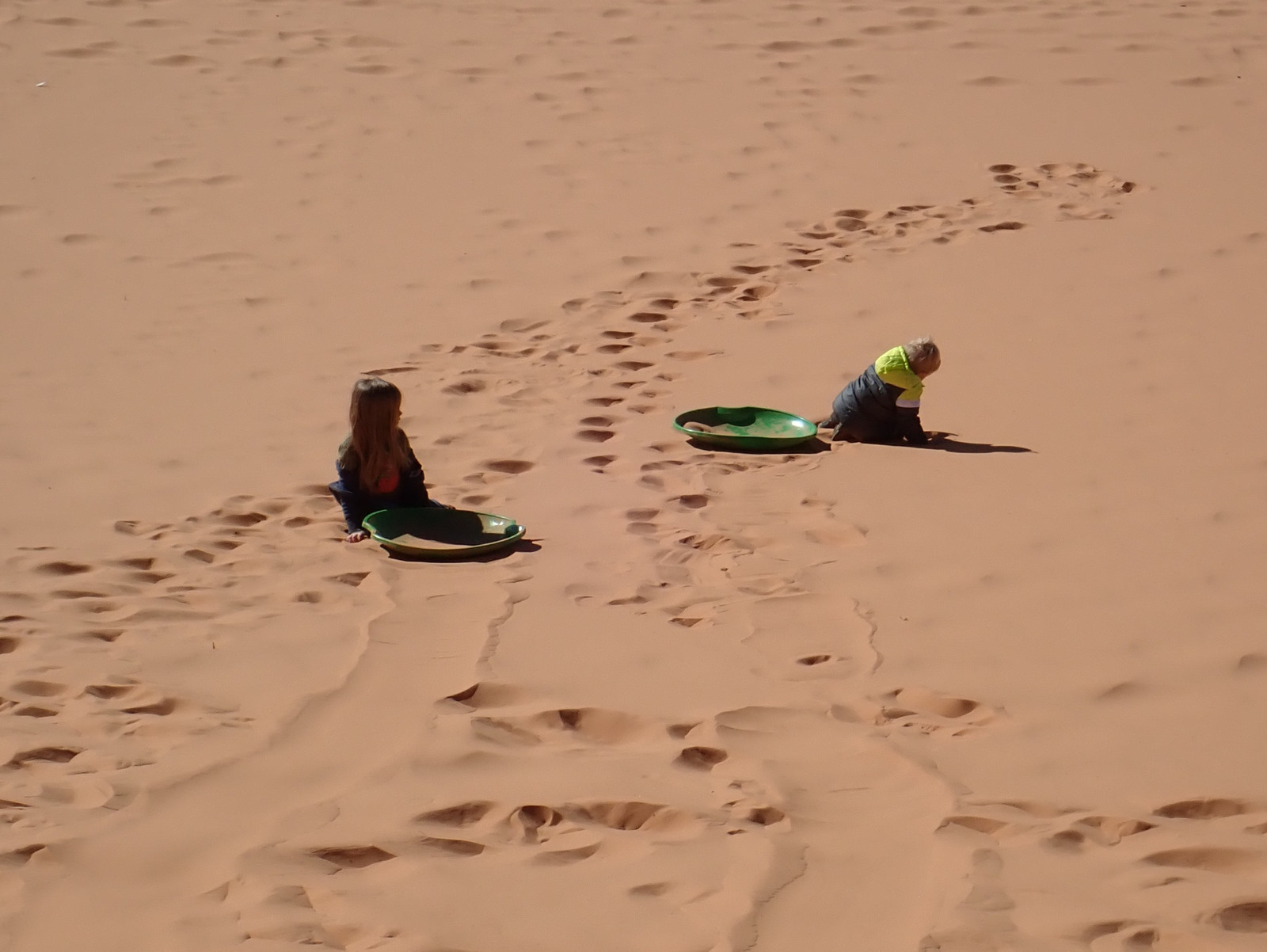 We tried to slide down the dunes, and it just never quite worked. You can slide down, but it wasn’t more than a slow, gradual slide, lubricated by the sand grains rolling on each other.