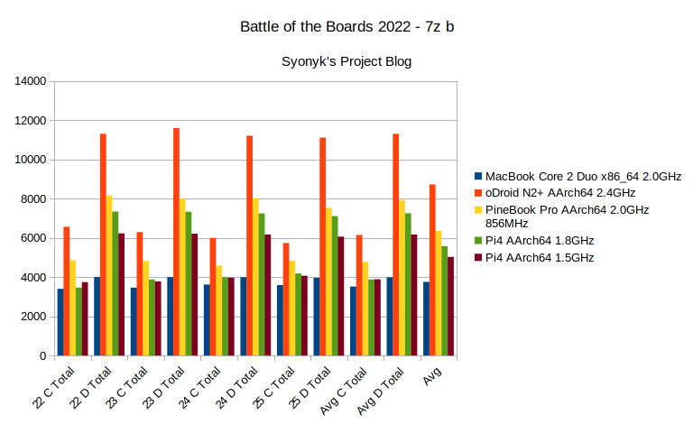 The 7Zip tool comes with a built in benchmark mode, and whatever the N2+ is doing, 7Zip really likes it. It dominates the calculated performance for 7Zip, with, no surprise, the PBP following, and the Pi4 coming in behind. Interestingly, in this test, the Core 2 Duo comes in last frequently enough, and there’s no real difference between the Pi4 at different clock speeds. I’m not sure exactly how this test reflects reality outside the 7Zip world, but it continues to demonstrate the the N2+ is, by a good margin, the fastest little ARM SBC in the tests.