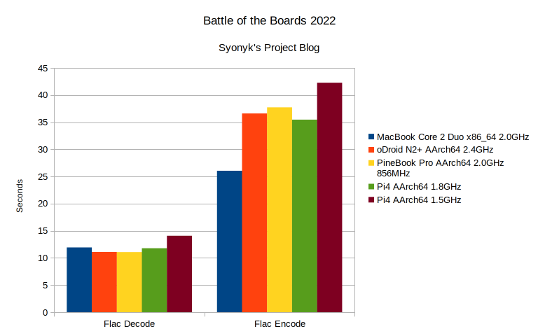 On the decode side, there’s no clear winner beyond “Not the 1.5GHz Pi4.” The rest are all pretty much even. On the encode side, clearly the flac developers have spent some time on Intel optimizations, because the COre 2 Duo just runs away with the contest. Everything else is, again, in the same ballpark except for the 1.5GHz Pi4. So, I suppose, overclock your Pi before encoding FLAC? Or just use Intel.