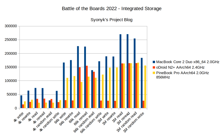 Finally, in what is an absolutely uneven test, I’ve run benchmarks on the “internal” storage for those boards that have it. For the MacBook, I’m running an OWC SATA SSD. For the ODroid, I’m running one of the HardKernel 64GB eMMC modules. And for the PineBook Pro, I’m running a 64GB Pine64 eMMC module. I’m of the impression (untested) that both the eMMC modules can be interchanged, but they’re clearly not the same hardware from the results (or the eMMC interface on the N2+ is just broken)..