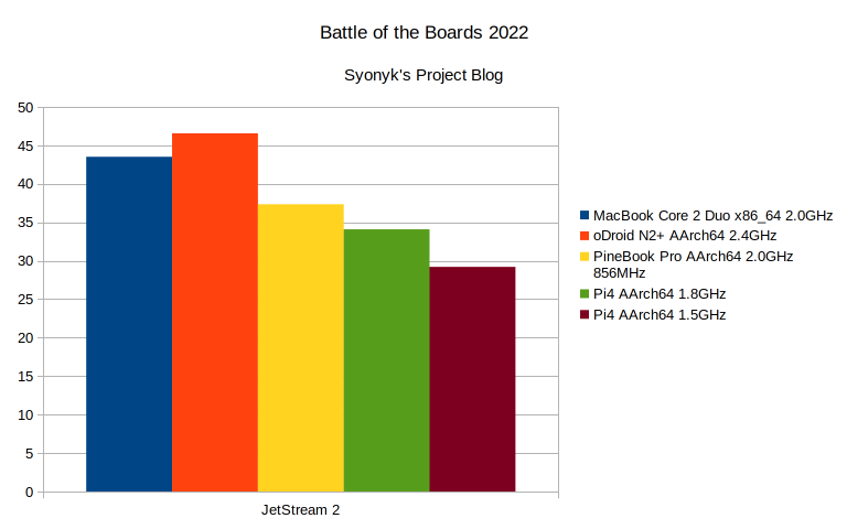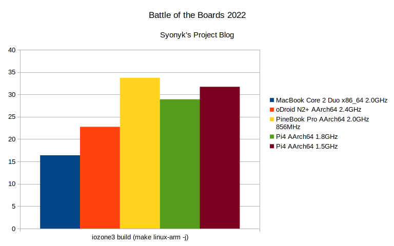 I like to build myself a fresh copy of iozone for benchmarking disks, and if I’m doing a build, I may as well time it! It’s not a particularly multi-threaded build, though I give make a fair chance with the -j flag. In any case, either the fast SSD on the MacBook or an awful lot of years spent on Intel optimization show up clearly here, with the MacBook coming in the far leader, followed by the ARM boards. I’ve no idea why the PineBook Pro is so slow at building here, but it is.