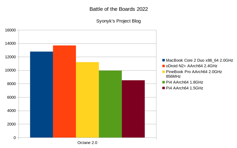 Moving on to Octane 2.0, where higher numbers are better, the N2+ takes the lead, with the MacBook coming in second. Once again, the performance delta between the two Pi4 speeds is obvious, and the PBP settles in the middle.
