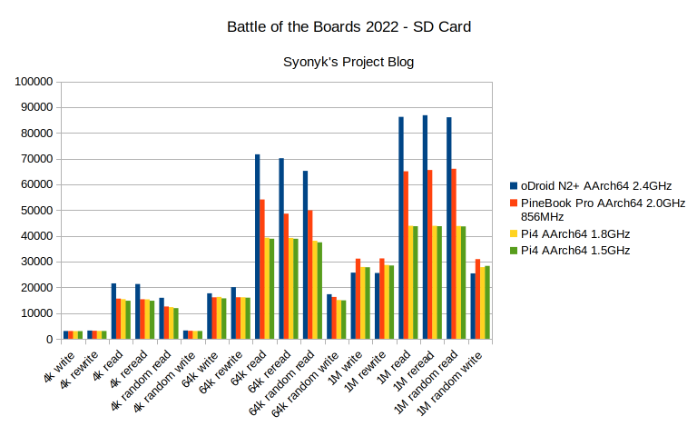 In general, for disk benchmarks, if everything performs the same, you’ve hit the limit of the disk. Here, for the 4k writes, it looks like the SD card is the limit. However, in reads, the N2+ and PineBook Pro clearly are getting a lot more performance from the card than the Pi4 - and the Pi4 doesn’t seem to be impacted by clock speeds, so it’s likely just riding the limit of the SD card interface. The N2+ reliably turns in the best read performance, followed by the PBP. For general system use, the read performance of the SD card impacts how the SBC “feels” in daily use, and clearly the N2+ is doing something right, followed by the PBP. For writes, though, the PBP pulls ahead, with even the Pi4 outperforming the N2+ on large writes for some reason.