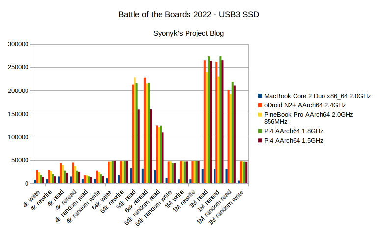 Moving to external storage, I have a USB3 SSD that I’ve also beat up with the boards. Everything except the MacBook supports USB3 here, and the MBP just struggles with the SSD, being “horribly glacial” on every test (worse than I’d expect for USB2). In the small block size accesses, the usual pattern shows up, with the N2+ in the lead, the PineBook Pro in second, and the Pi4 being impacted by CPU speed. However, for the larger reads, the Pi4 manages to come in even with, or sometimes slightly ahead, of both the N2+ and PBP. Unfortunately, for general OS use, these big reads aren’t a limiting factor. My SSD appears to be capable of taking about 45MB/s write, and all the systems are pretty much even on the larger block writes. The main takeaway here is that USB3 performance on ARM seems to be impacted by CPU performance at smaller block sizes, and everything seems to end up with about the same performance at large block sizes.