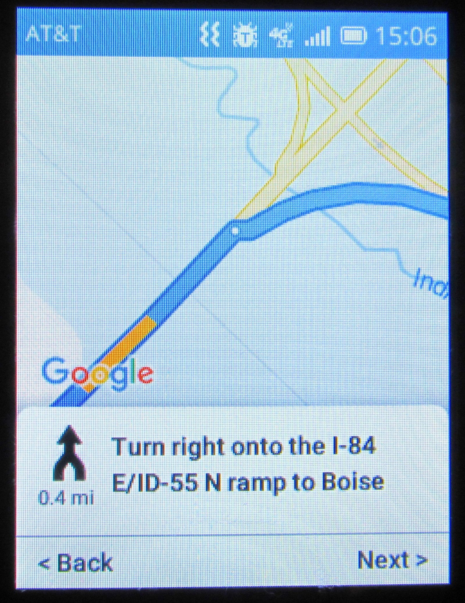 You can get the directions and turns - it just won’t automatically follow them for you, nor will it manage anything resembling speaking them to you. Here, you’d tap the “Next” button (remember, no touchscreen!) after merging onto the highway. Not great. Workable, though.