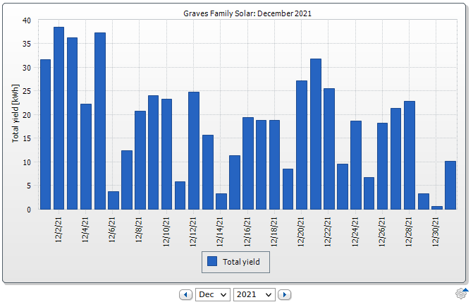 On the flip side, December was far less-good. And you can see why - production was often very low from cloudy days (note that the scale is different here too - full height is 40kWh vs 120kWh on the June chart). Such is winter. You can get the occasional good day, but they’re few and far between, and still far shorter than a summer day. Despite having a ton of panel area hanging out, I didn’t get much out of the sky in the winter. You really gain an appreciation for the insane useful dynamic range of the human eye with solar - despite almost zero production on Dec 30, your eyes work just fine, and adjust. Sure, it’s dark, but it’s not perceived as a factor of 100 darker out.