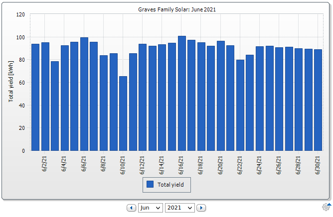 The best month was June - clear skies, windy and cool (compared to fall), long days, and solid, steady production all month long. We peaked over 100kWh generated a few days, and our worst day was still over 60kWh. This is what good sunny weather production should look like.