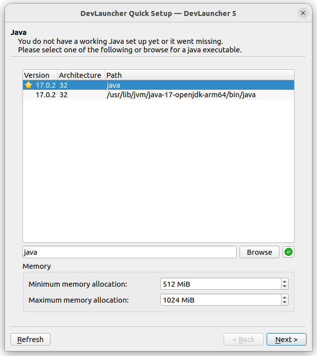 You should see a list of Java installs - select one. You’ll want Java 17 for a recent version of Minecraft, and I’ll suggest you want to up the RAM by a good bit - maybe 1500MB for minimum and maximum (just set them to the same, Java is garbage collected, though the GC has a major exemption for Java and somehow refuses to collect Java). Enable analytics in the next screen if you care… and, no, I don’t know why an AArch64 Java install is detected as “32” in the Architecture field. It doesn’t seem to matter.