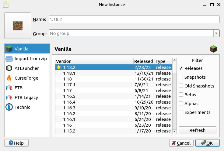 Next, you’ll add a Minecraft install. Click Add Instance, and select whatever the latest is (assuming you want that version).