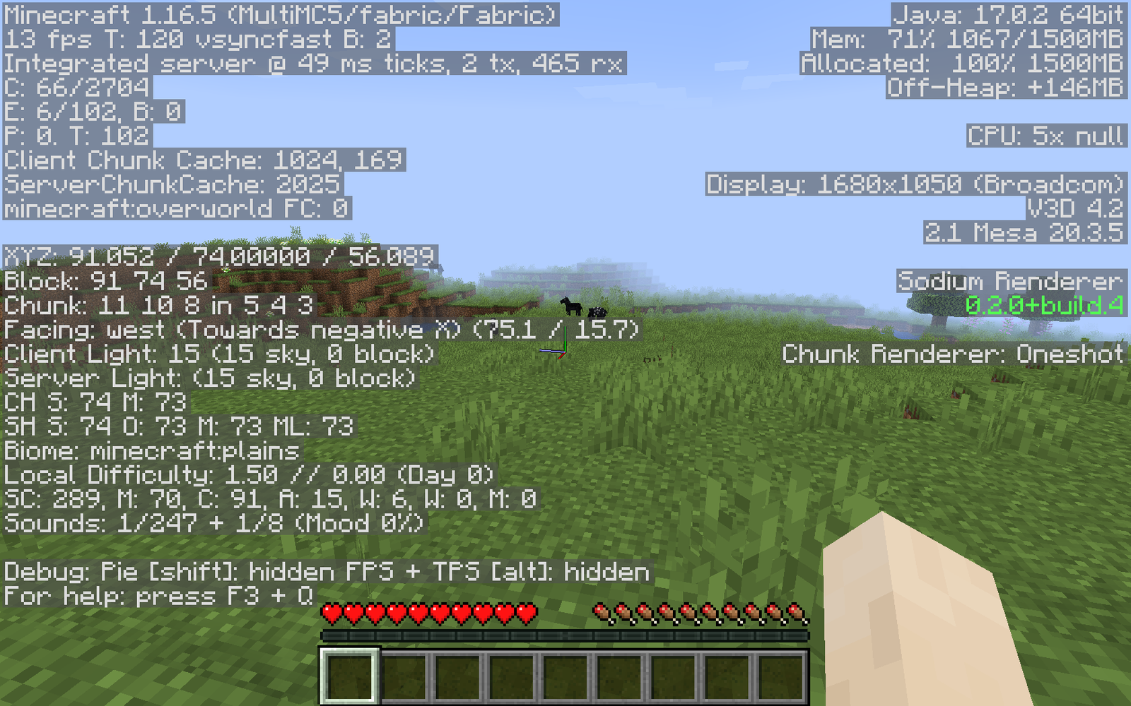 Now try playing things. Hit F3 and you can see frame rates - you should also see that it’s using the Sodium render engine. Performance will be quite low initially, and if you look in the top right of the debug frame, you’ll see memory use just ripping up and down, over and over. This is the initial world loading stage (with tons of Java garbage collection), and it takes a while on a slower machine - but, eventually, it will stop doing that and switch to a gradual increase in memory use (under 5MB/s while standing still), CPU use will drop a bit, and your frame rate should go up!