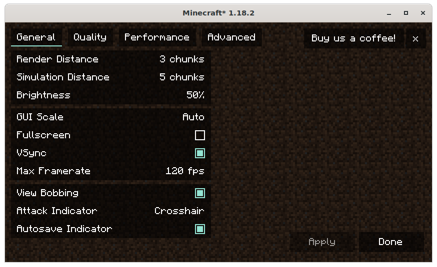 Turn everything down. You can turn it up later once it’s playable, but, to start, turn everything down. Render distance to 2, sim distance to 5 if you’re dealing with a remote server. In the Quality settings, fast graphics, clouds off, weather fast, options off, mipmap levels 0x. Turn on all the performance options, and you should be good! On the Pi4, you’ll need to leave “Use Chunk Multi-Draw” off, or things won’t render properly.