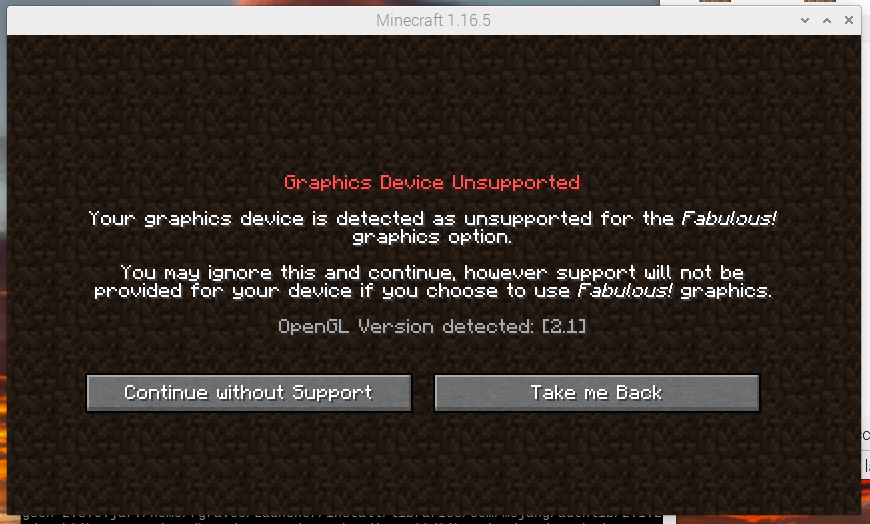 Why can’t the Pi4 play a recent Minecraft? The transition to 1.17 increased the required OpenGL version from ~2 up to 3.2 - and the Pi4 only supports OpenGL 2.1. If you know of any hacks to work around this, please try them and report back, but, as of right now, I’ve run out of ideas to get 1.18 running on the Pi4.