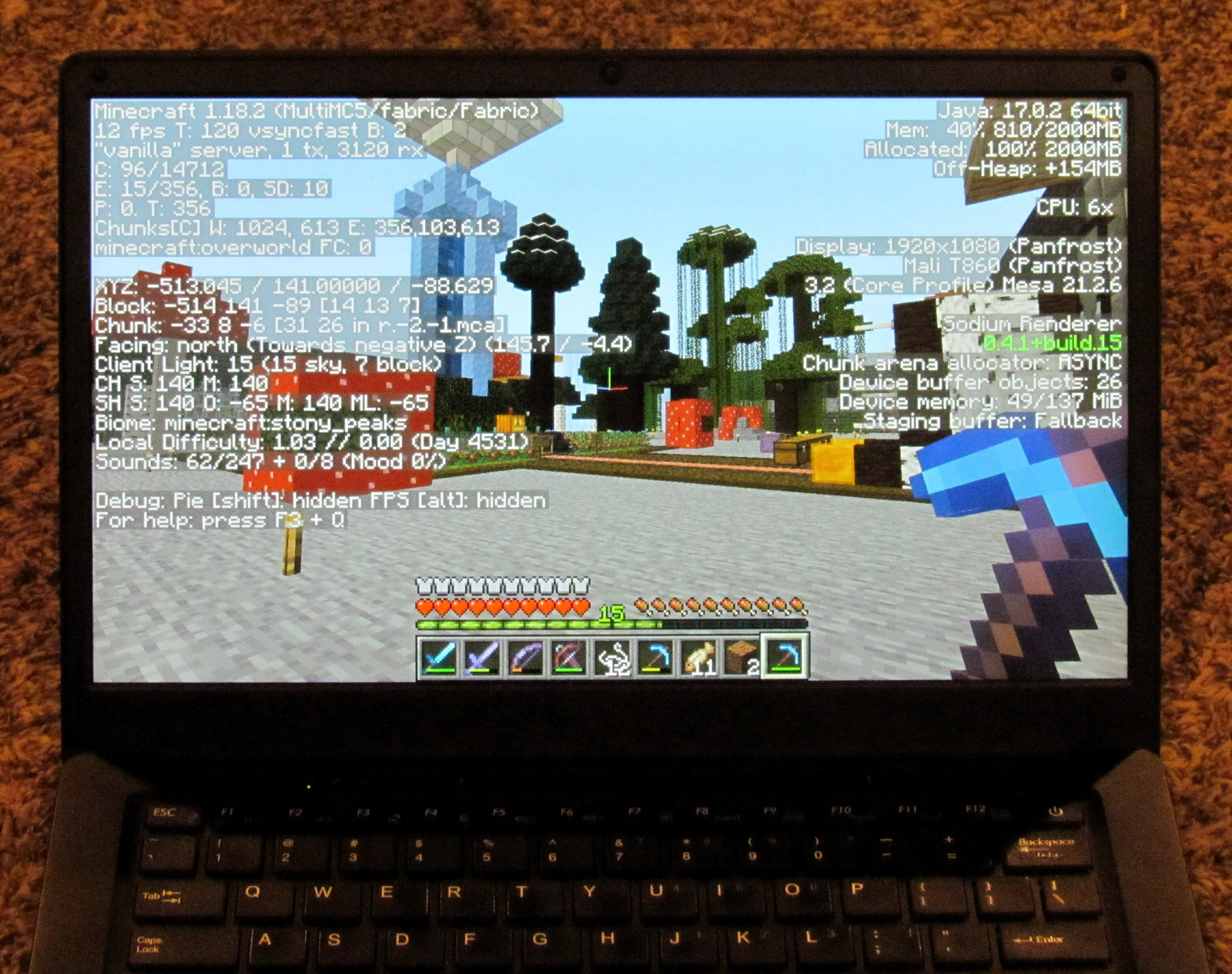 It’s not all good news. The Raspberry Pi 4 lacks the OpenGL version to play anthing past 1.16.5. But, the ODroid N2+ and PBP will play fully up to date Minecraft, and, surprisingly, the PineBook Pro is quite good at Minecraft for this class of machine! It’ll even hold a playable frame rate in fullscreen!