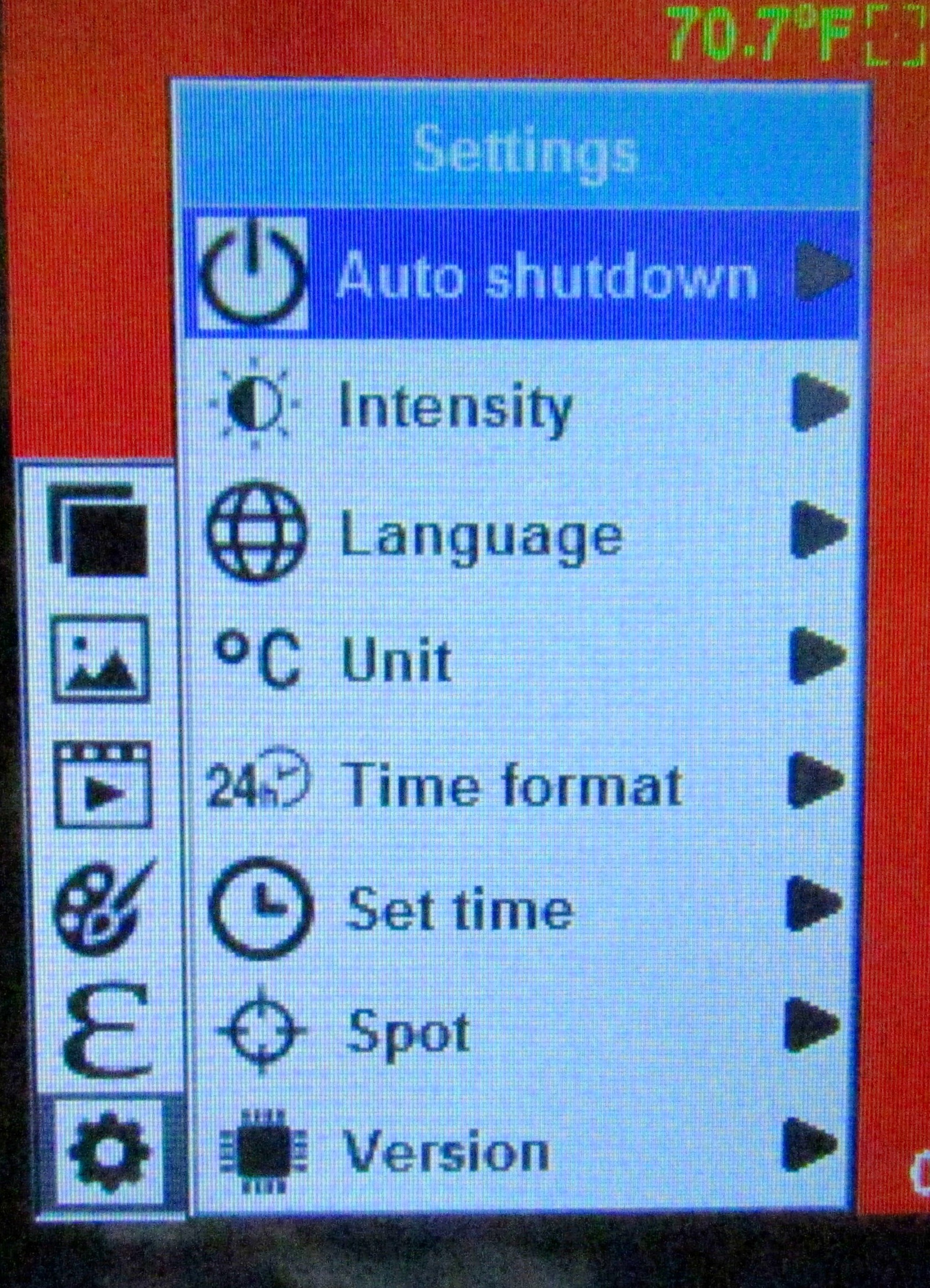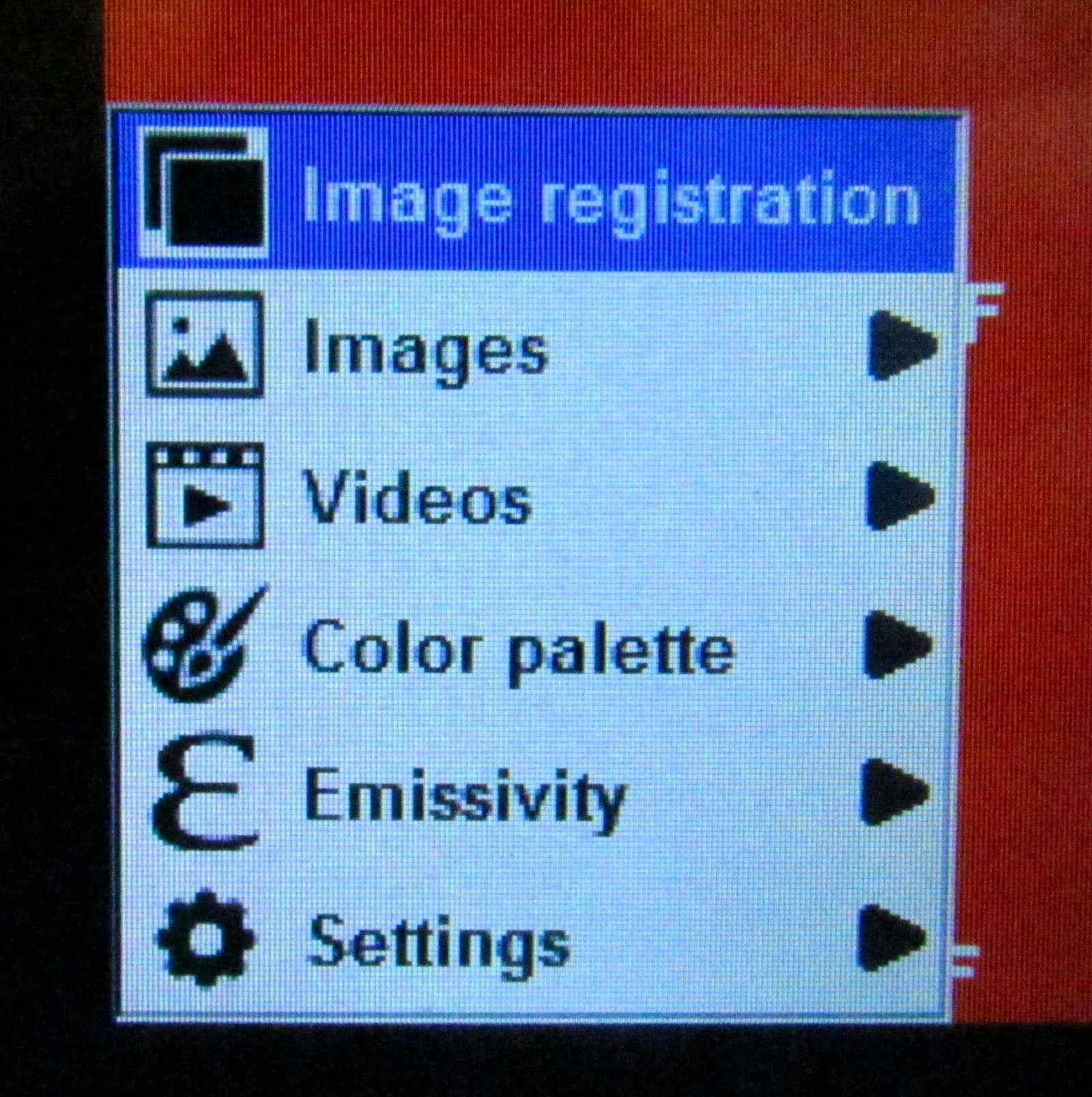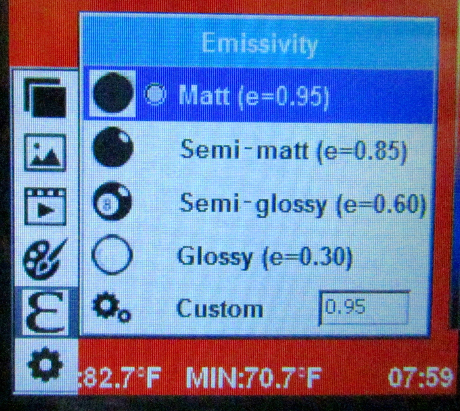 The emissivity menu allows you to (surprise!) set the emissivity of the surfaces you’re measuring. This is a complex topic, and there are entire courses on properly compensating for it, but just know that polished surfaces reflect heat as well as light. If you’re trying to measure the temperature of a shiny metal object, you’re going to measure the background reflecting it far more than the surface. The emissivity theoretically lets you compensate for this, though if you’re aware of how heat reflects, it’s perhaps somewhat less useful. You’re the one interpreting results - so if you find that a spot in your window is a few hundred degrees, you’re probably measuring the sun.