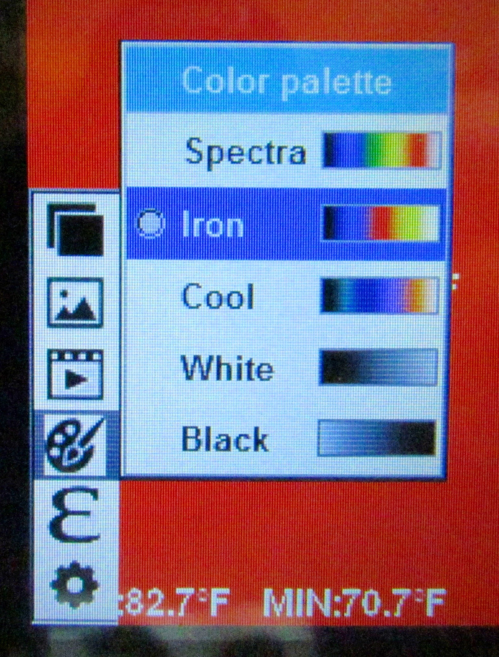 Color palette allows you to select what colors you want to use to reflect heat. I’ll cover the options later, but I find “iron” useful, and “white” is also of some use. The others, I just don’t find terribly useful.