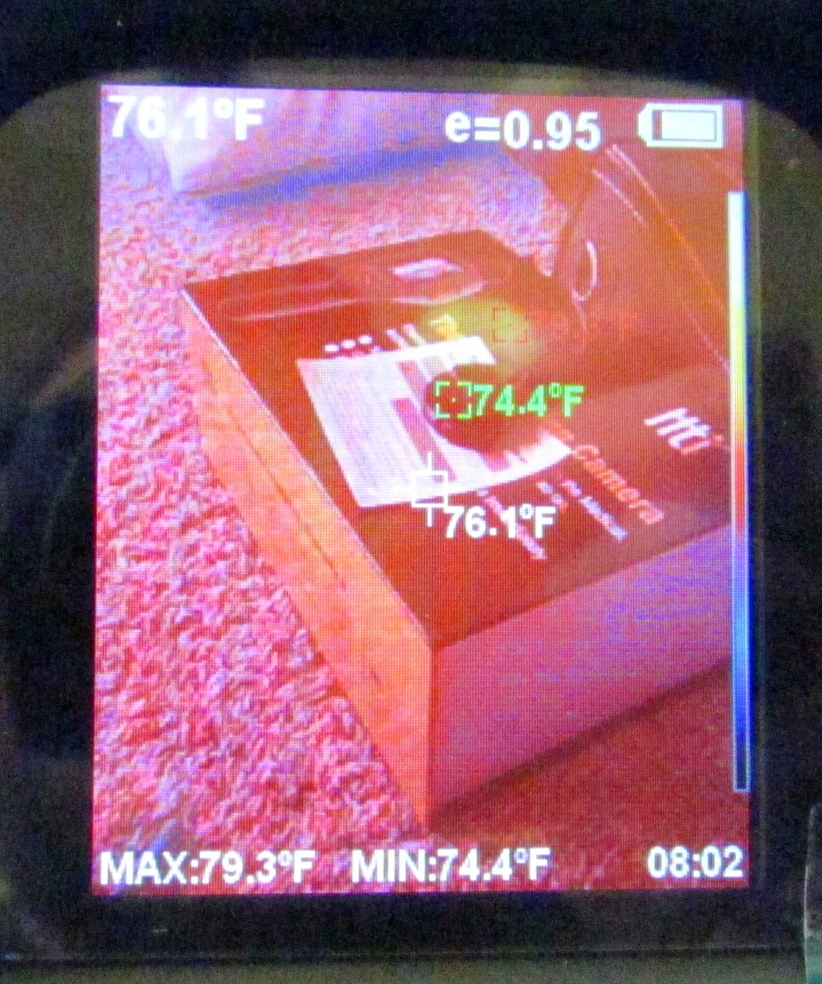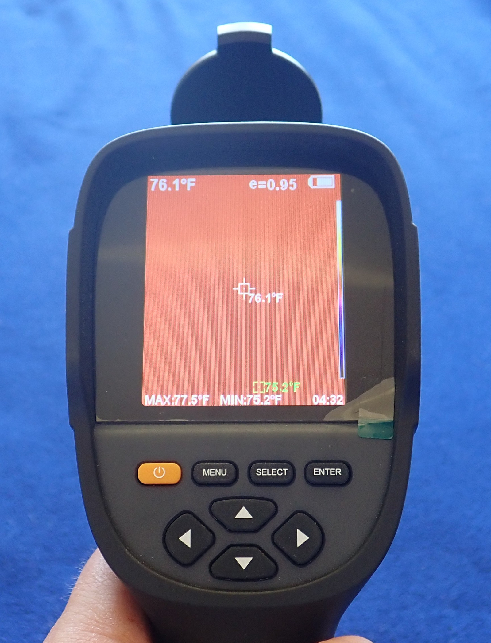 Turn it on, and you get the UI! Top left is the center point temperature, top right is the current emissivity setting and battery. In the bottom, min and max temps (my blanket here is clearly fairly uniform in temperature), the time, and on the right, the thermal scale for reference. On bright, the screen is visible even outside (though you may want to shade it a bit with a hand).