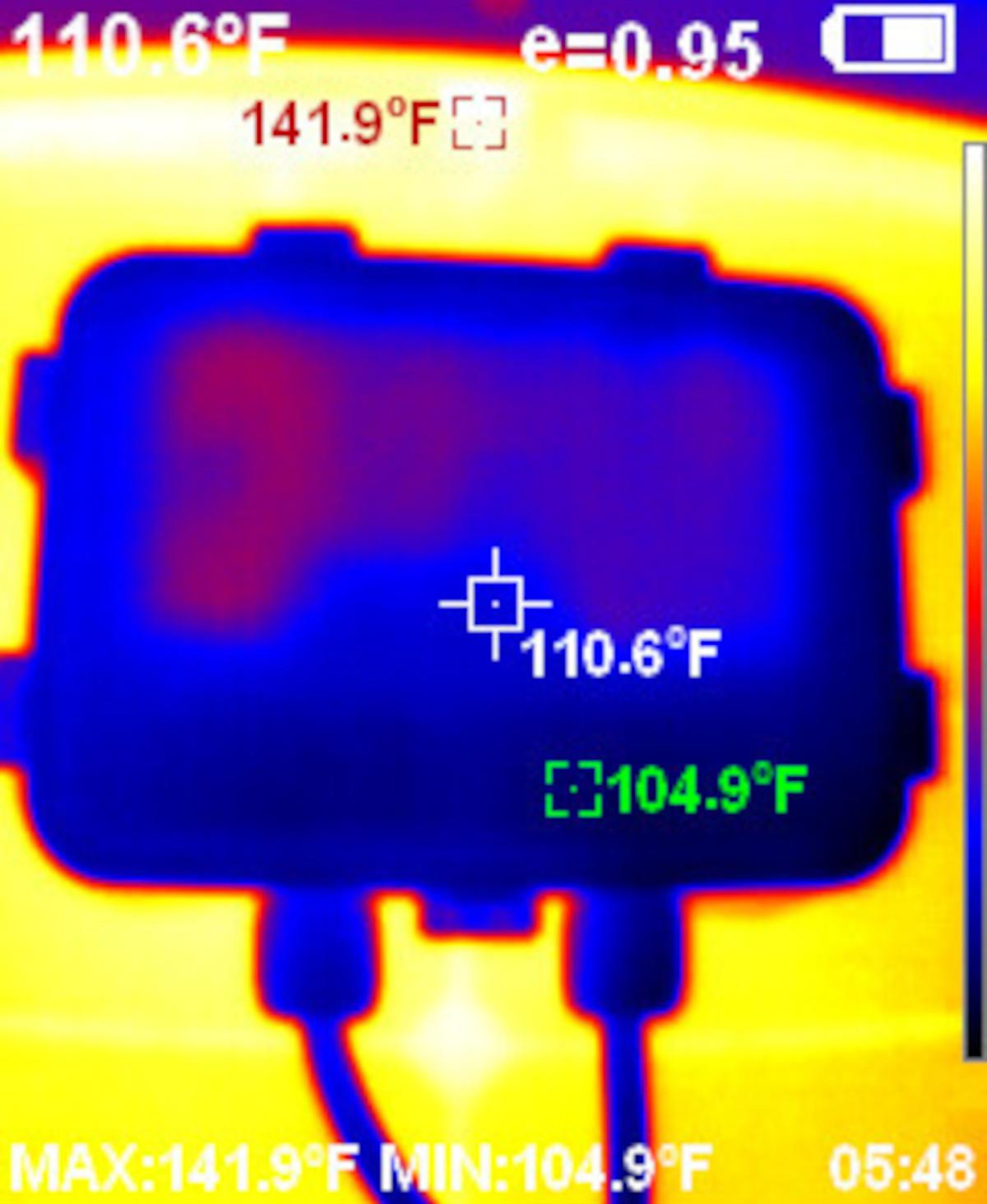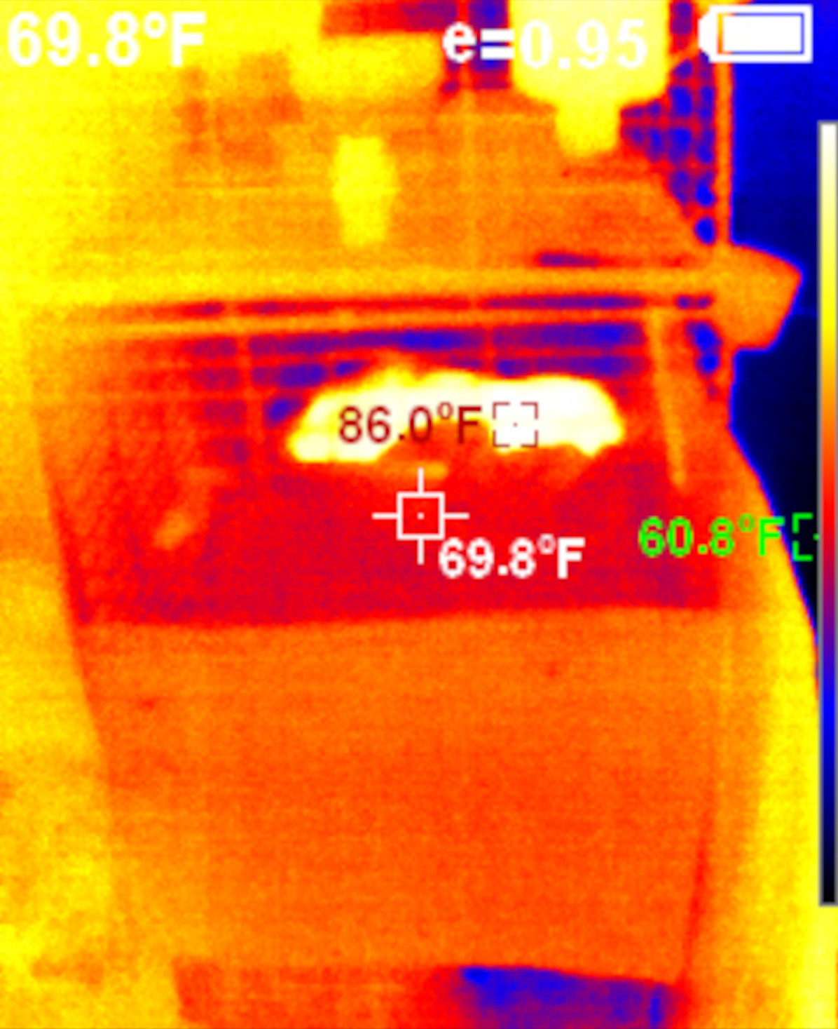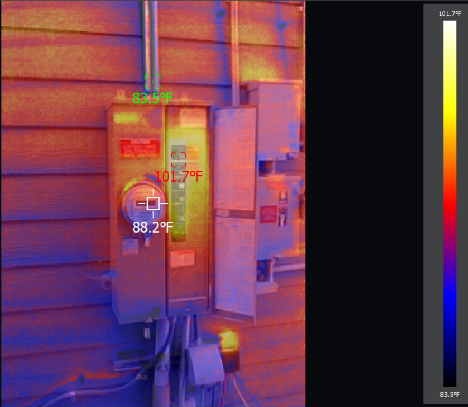Electrical uses are an extension of solar, but you can point it at various things and see if they’re “abnormally hot” from some distance. The offset is a bit wrong here from being closer than I have things set for, but my PV breakers are running “warmer than the rest of the panel.” Except, the whole panel is pretty hot, it’s 90F outside, and PV is producing well. I have no concerns about this. Were the breakers up past 150F, I’d have the front off looking for loose connections. Faults are high resistance. High resistance is hot. You can identify these at a distance with even a cheap thermal imager!