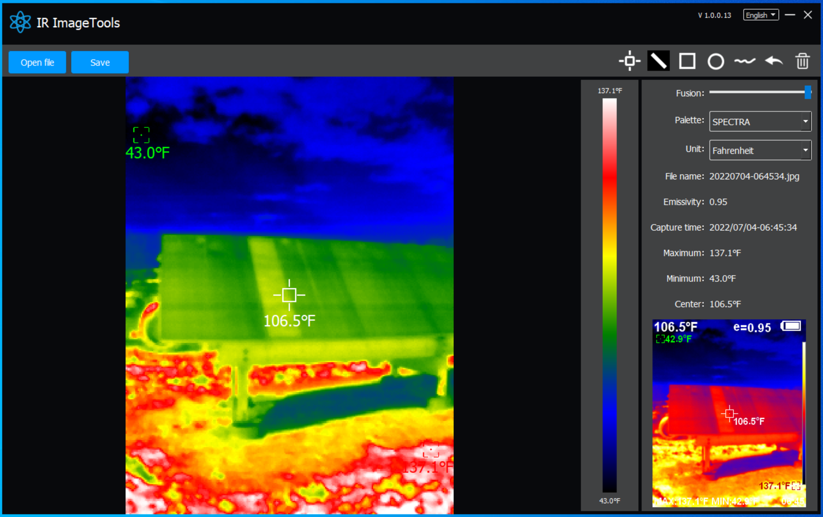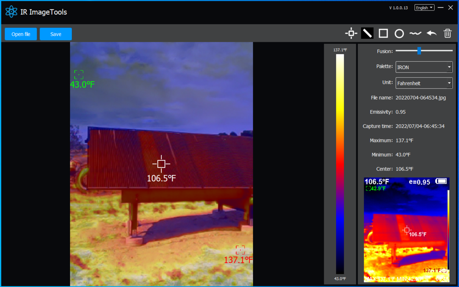 You can set the “Fusion” slider anywhere you want, not just the 0/25/50/75/100% points that the handheld unit allows - so you can set things where you need to highlight things. And you can change the palette to whatever you want. Here, I’ve got the “Iron” palette (which I prefer) overlayed with the image to really highlight that hot set in the #2 panel on my north array.