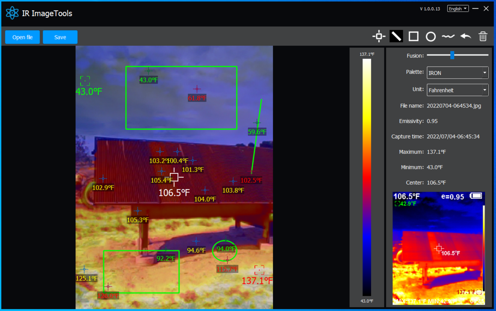 But you can do more. You can draw lines that mark the hottest and coldest point, put markers that show temperature in new areas, draw circles, scribbles, etc. These will show you the hot and cold points within that region. The “Undo” button and “Trash” button do what you’d expect, removing either the last annotation or all of them. I’ve never played with thermal imaging analysis software before, but this does everything I’d expect and a bit more in the deal. The “save” button exports a screenshot of the current status.