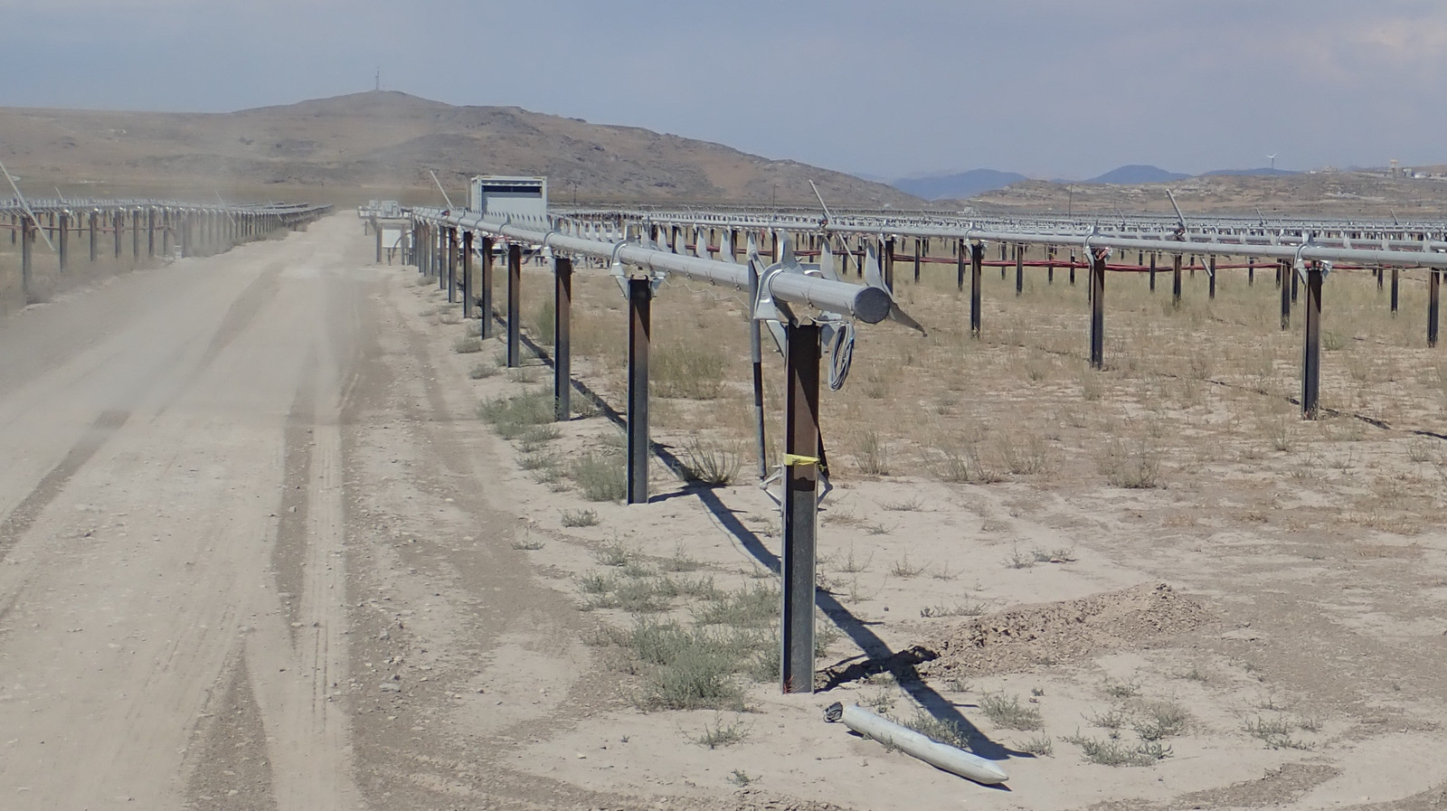 The plant is… just this, over and over and over. There’s a single main support pipe for the panels, hanging in pivots that allow it to rotate back and forth to track the sun. This is all supported on small I-beams either concreted into the ground, or perhaps just driven in with some variety of large impact driver. There’s a decent amount of adjustment on them, as I’ll show later.