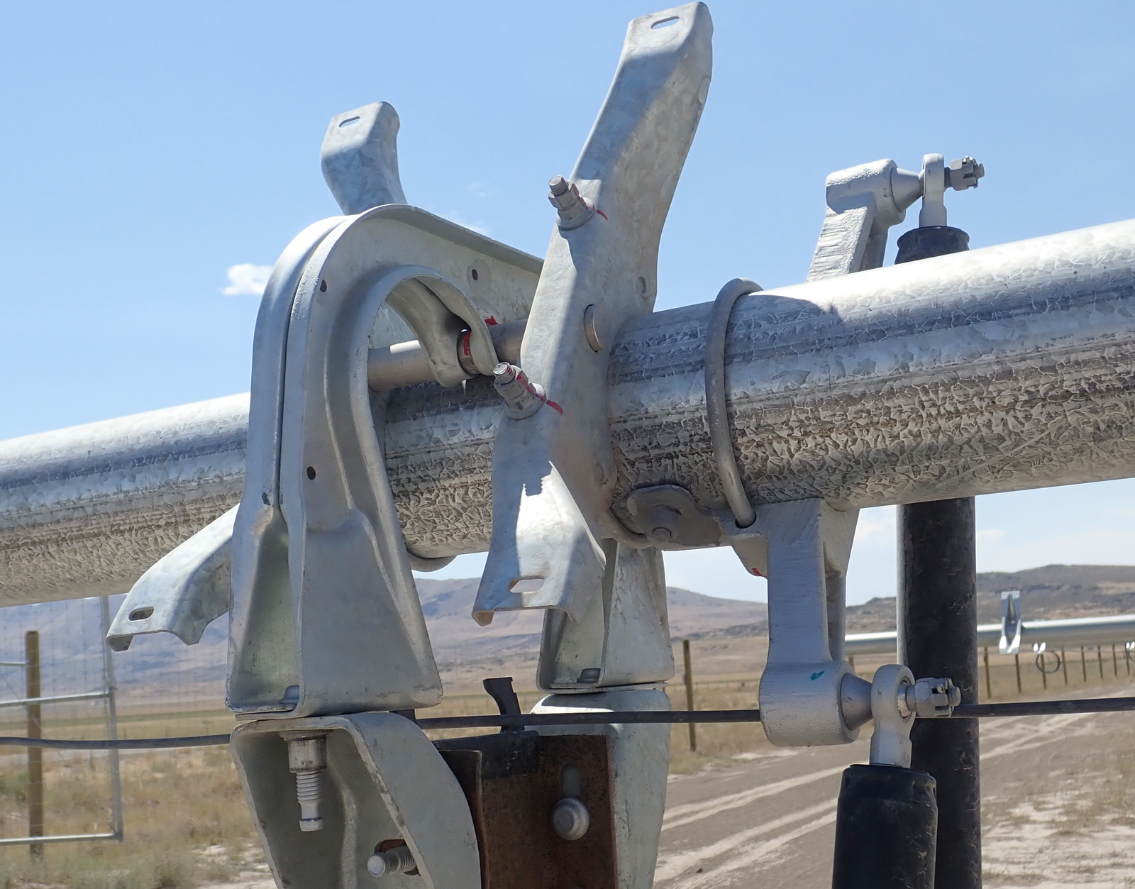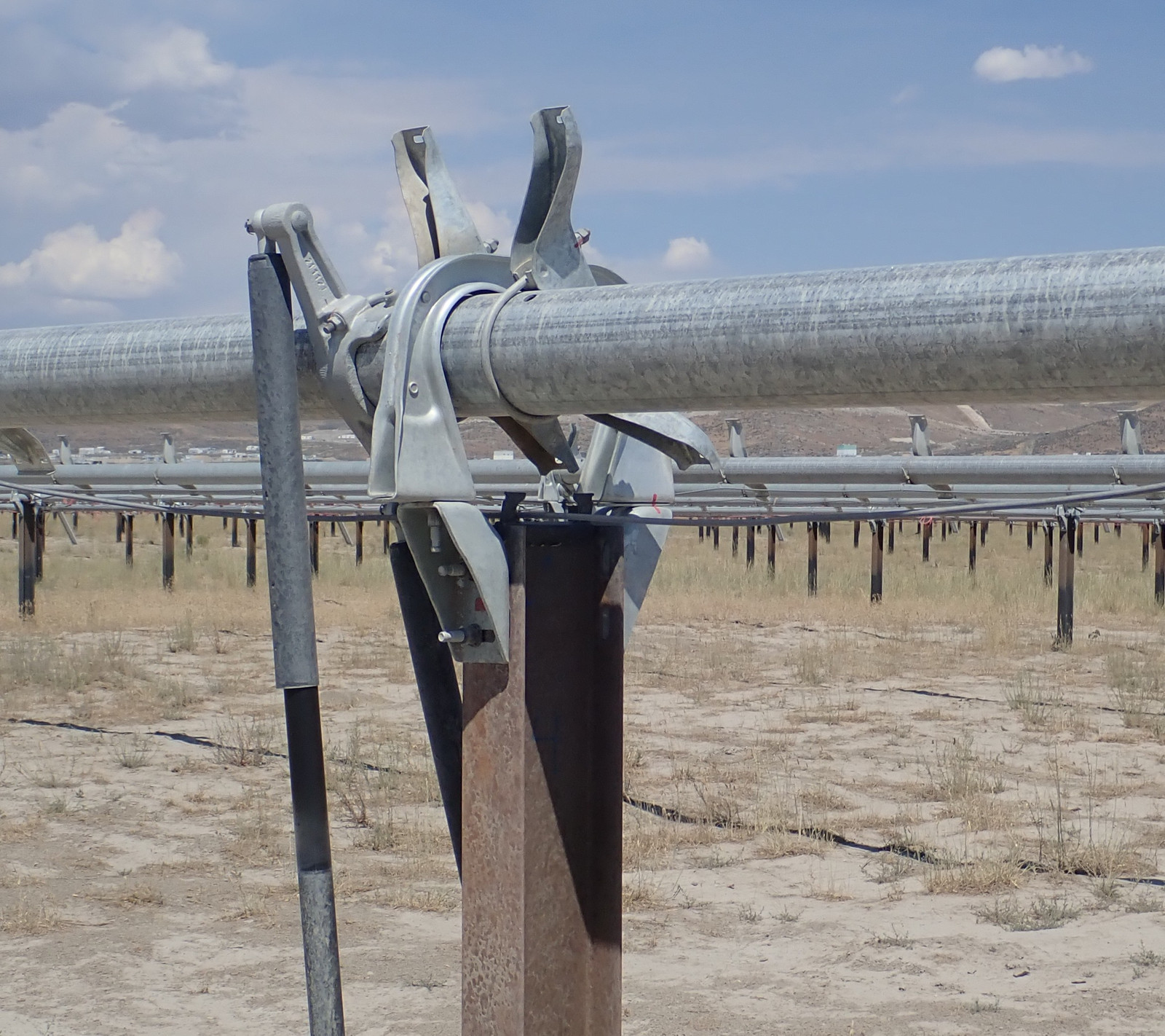 This is the end pivot. Important things to notice here: All the parts simply bolt together. There is a lot of adjustment in how things can bolt, which means that the installation of the I-beams can have loose tolerances. Look at the width of the slot in the lower mount. Good for keeping costs down. Also, the yoke that the shock absorbers connect to is a separate device, simply U-bolted over the pipe. It’s not a different model of the main pivot. And, bolted to the pipe with easy-to-install U-bolts, the mounts for the panel frames, in whatever form those take. As far as I can tell, the shock absorbers are only at the end, with the main motor drive installed in the center. I’m not certain how stiff they are, but to prevent any sort of nasty vortex shedding oscillation in the rows, I would assume “very stiff.”