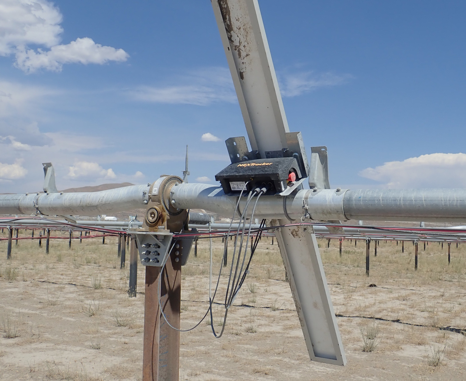 In the center of each string is a NEXTTracker module. These are the drivers for the single axis tracking, with solar panels and the rotation motor assembly that moves each string of panels. You’re welcome to try to find more than marketing details, but I didn’t have much luck. It seems to be an entirely self-powered module on each string - I saw no evidence of any connection to any sort of grid power to manage tracking, and the antenna on top of the motor/main bearing assembly argues that they’re wireless and quite independent of any sort of wired infrastructure. You can see the motor sticking out on this side, with what I would assume is a worm gear drive to the main pivot. You can also see how the “not aligned with the axis of rotation” problem is solved - those bent coupler segments adjust things so the motor is aligned with the pivots. Lots of flexible wiring around here.
