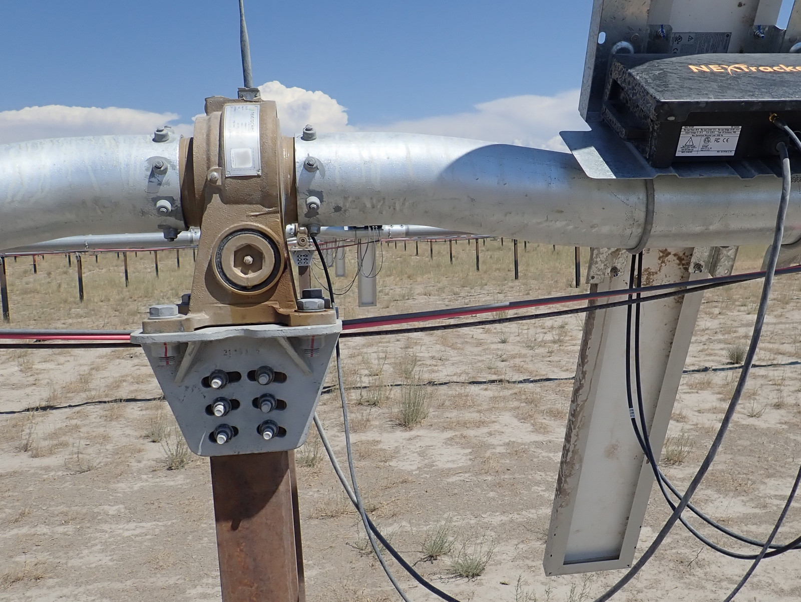 In conversations with people about DIY single axis trackers, there’s been a lot of talk about bearings of various sorts (mostly of the “large” and “ball or roller” variety). How would you mount and align them, how do you adjust them for minimum friction, etc. Clearly, we’ve been approaching the problem very wrong. That’s not what commercial trackers use. This is a plain, not-even-greased-as-far-as-I-can-tell bearing consisting of “a rod driven through some stamped metal supports.” The core tube simply pivots back and forth below the support, not aligned with the axis of rotation. You’ll see how that works later.